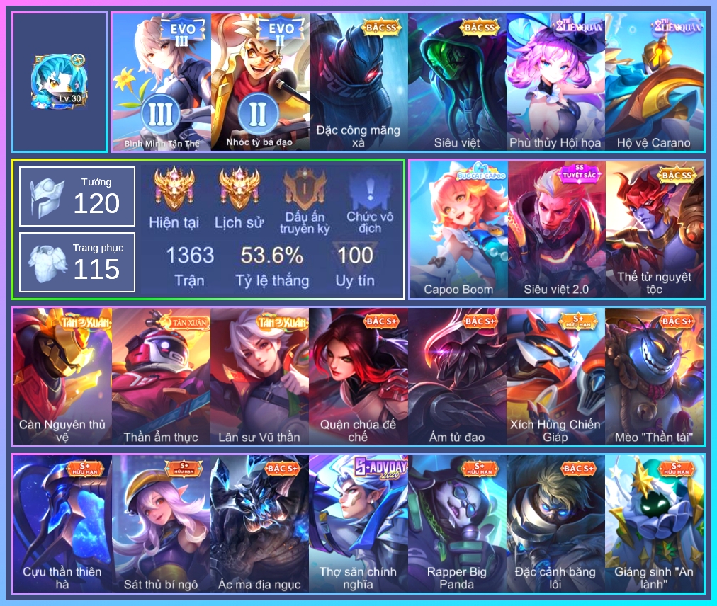 Arthur Si Tình Kiếm, Arthur Đặc cảnh băng lôi, Krixi Phó văn nghệ, Krixi Thuỷ Thủ, TelAnnas Chung Tình Tiễn, Telannas Dạ hội, Butterfly Teen Nữ Công Nghệ, Triệu Vân Quý Công Tử, Điêu Thuyền Mèo công nghệ, Violet Huy Chương Vàng, Quillen Nghịch thiên long đế, Gildur Đại gia học viện, Azzenka Quang Vinh 2.0, Celica S-Quang Vinh, Keera Nghệ sĩ Graffiti, Richter Cứu hộ, Teeri Tiểu kì lân, Raz Siêu việt, Xeniel Tay trống ngang tàng, Iggy Tiếng thét Hỗn mang, Dirak Đường chủ yêu giới, Fennik Đội đặc nhiệm, Fennik Shipper Siêu thanh, Slimz Sứ giả Thiên giới, Slimz Siêu Cấp Tối Thượng, Arum Quản lý tài năng, Toro Ngưu hải vương, Annette Xứ sở thần tiên, Tachi Đao khách vô tình, Omen Thuyền trưởng hải tặc, Liliana Thuỷ thủ hồ ly, Bijan Đập vỡ Cây đàn, Nakroth Producer Tia chớp, Zill Thần mộng mị, Roxie Cháy Phố, Max Chuyên gia đập hộp, Sinestrea S-Quang vinh
