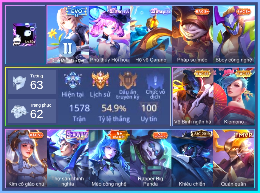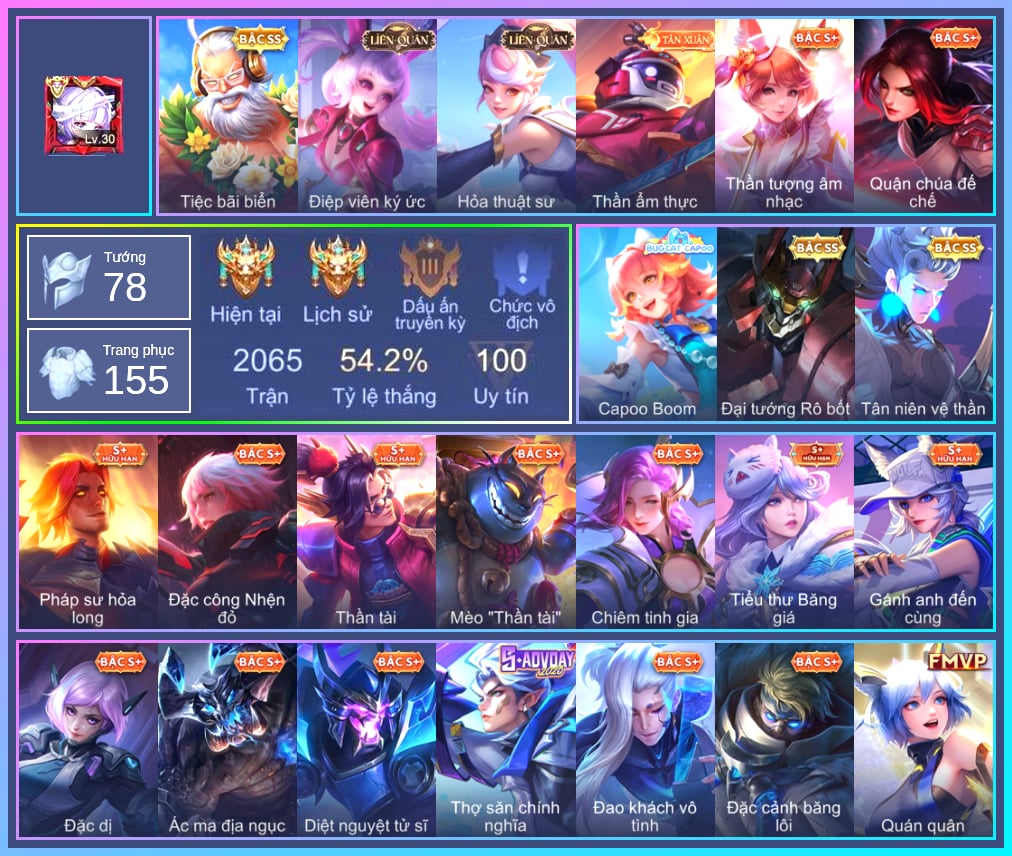 Arthur Đặc cảnh băng lôi, Krixi Cô Tiên Thỏ, Krixi Phó văn nghệ, Krixi Thuỷ Thủ, TelAnnas Giám thị thân thiện, TelAnnas Chung Tình Tiễn, Telannas Dạ hội, Valhein Hoàng tử Quạ, Valhein Khiêu chiến, Valhein S-Quang Vinh, Butterfly Teen Nữ Công Nghệ, Butterfly Quận Chúa Đế Chế, Violet Phi Công Trẻ, Violet Đặc Dị, Violet Huy Chương Vàng, Natalya Quý Cô Thủy Tề, Triệu Vân Quý Công Tử, Triệu Vân Dũng Sĩ Đồ Long, Triệu Vân Thần Tài, Maloch Ác Ma Địa Ngục, Maloch Tiệc hóa trang, Maloch Ác nhân vô tuyến, Veera Cô giáo hắc ám, Ngộ Không Đạo tặc, Ngộ Không Cổ thần Ai Cập, Grakk Thuyền Trưởng Râu Đỏ, Grakk Mèo thần tài, Alice Xứ sở thần tiên, Hayate Quỷ diện, Hayate Bạch lang, Stuart Vua hề, Stuart Gã hề, Rouie Quang Vinh, Yorn Đặc Nhiệm Swat, Yorn Soái ca bãi biển, Max Chuyên gia đập hộp, Yena Nữ hoàng thể thao, Yena Nữ cướp biển, Florentino Kiếm sĩ Olympic, Liliana thần tượng âm nhạc, Liliana Thuỷ thủ hồ ly, Kahlii Tử điệp, Zill Lốc Địa Ngục, Zill Thần mộng mị, Kriknak Bọ Cánh Bạc, Slimz Sứ giả Thiên giới, Ignis Hỏa Thuật Sư, Ignis Bắc băng vương, Amily Nữ đội trưởng, Azzenka Quang Vinh 2.0, Lorion Chiến giáp hắc ám, Fennik Nhà thám hiểm, Fennik Đội đặc nhiệm, Fennik Tiệc Bánh Kẹo, Raz Đại tù trưởng, Raz Saitama Cosplay, Sephera Thủy Liên Hoa, Zuka Đầu bếp hoàng cung, Errol Stream đến bao giờ, Yan Giấc mơ sao, Murad S-Quang Vinh, Lauriel Nữ vương học đường 2, Quillen Đặc công mãng xà, Aleister siêu sao bóng rổ, Zephys Tư lệnh viễn chinh, Baldum Đồ chơi, Celica S-Quang Vinh, Veres Đạo tặc, Qi Tiểu long, Richter Quang vinh 2.0, Lữ Bố Vũ điệu Samba, Airi Đặc công tử điệp, Roxie Cháy Phố, Roxie Hỏa thuật sư, Aya Điệp viên ký ức, Enzo Phẩm chất quý tộc, Enzo Thần thoại Hy Lạp, Ryoma Dạ hội, Volkath Tư lệnh viễn chinh, Điêu Thuyền Nữ Vương Anh Đào, Dextra Quý cô Tuổi Dần, Capheny S-Quang Vinh, Keera Hồ điệp, Xeniel Shipper bánh mỳ, Ata Mèo đi mưa