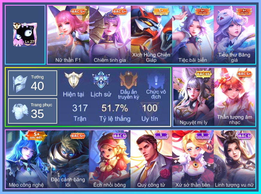 Valhein Hoàng tử Quạ, Valhein S-Quang Vinh, Krixi Công chúa Bướm, Gildur Đại gia học viện, Natalya Quý Cô Thủy Tề, Taara Hỏa Ngọc Nữ Đế, Airi Đặc công tử điệp, Murad M-TP Thần Tượng Học Đường, Murad Đồ thần đao, Murad Điệp viên Anubis, Kahlii Kim cô giáo chủ, Kahlii Rối Nước Thuỷ Đình, Mganga Hề cung đình, Toro Đặc cảnh NYPD, Errol Đêm ác mộng, Nakroth Quân đoàn địa ngục, Violet Nữ đặc cảnh, Violet Phó học tập, Amily Đặc cảnh NYPD, Kriknak Bọ Cánh Bạc, Lindis Thám Tử Tư, Lindis Quang Vinh, Annette Nữ quản ga, Annette Băng kỳ lâm, Richter Bá tước, Xeniel Thiên Sứ Hủy Diệt, Xeniel Kim sí điểu, Preyta Không Tặc, Zuka Đại Phú Ông, Wisp Hải Tặc Nhí, Alice Xứ sở thần tiên, Zill Lốc Địa Ngục, Ilumia Nữ Chúa Tuyết, Aleister Thiếu Niên Hắc Ám, Aleister Xứ sở thần tiên, Butterfly Bình Minh Tận Thế, Arduin Quang Vinh 1, TelAnnas Quang Vinh, Azzenka Ghẹo hay kẹo, TeeMee Xiếc Cung Đình, Liliana Tiểu thơ anh đào, Liliana Thuỷ thủ hồ ly, Veres Thần thoại Hy Lạp, Enzo Phẩm chất quý tộc, Enzo Chiến binh trăng khuyết, Thorne Ước nguyện giáng sinh, Lorion Chiến giáp hắc ám, Laville Tay đua đường phố, Omen Sĩ Quan Viễn Chinh, Rouie Quang Vinh, Ishar Giấc Mơ Ngọt Ngào, Ishar Tiểu thư kẹo ngọt, Ryoma Thợ Săn Tiền Thưởng, Sinestrea S-Quang vinh, Elandorr Soái tặc, Aoi Tiệc bãi biển, Aoi Quán Quân, Dolia Môn đồ tập sự