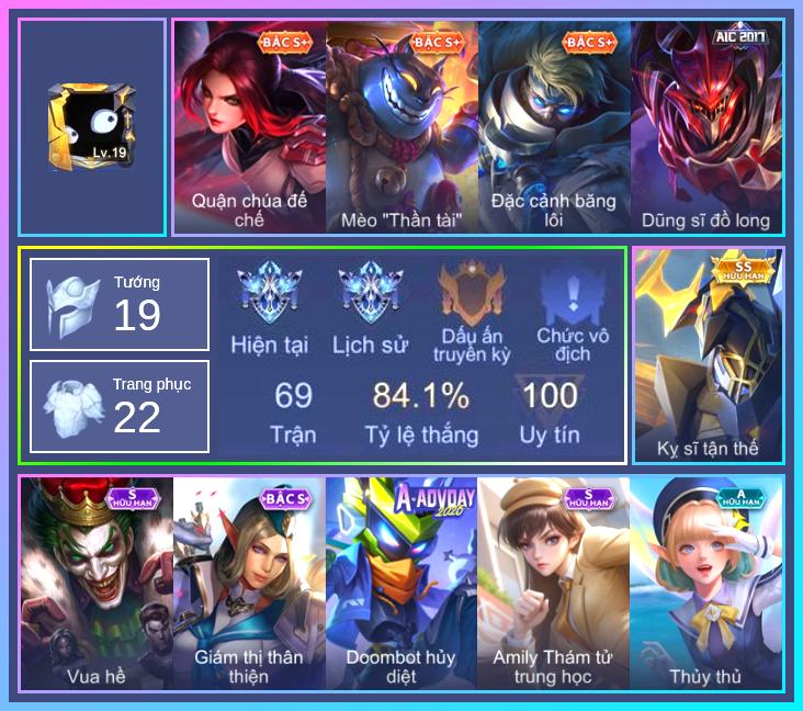 Valhein Hoàng tử Quạ, Triệu Vân Quang Vinh, Butterfly Quận Chúa Đế Chế, Yorn Đặc Nhiệm Swat, Aleister Quang Vinh, Aleister Quỷ soái nguyệt tộc, Veera Goá Phụ, Điêu Thuyền Nữ Vương Anh Đào, Lữ Bố Nam Vương, Kahlii Siêu đầu bếp, Gildur Đại gia học viện, Mganga Hề cung đình, Taara Hỏa Ngọc Nữ Đế, Arthur Hoàng kim cốt, Arthur Lãnh chúa xương, Arthur Siêu sao Cricket, Zill Dung nham, Zill Thần mộng mị, Violet Phó học tập, Violet Đặc Dị, Airi Thích Khách, Airi Lễ hội mùa xuân, KilGroth Cảnh Vệ Biển, KilGroth Quang Vinh, Grakk Mèo thần tài, Ngộ Không Đạo tặc, Krixi Phó văn nghệ, Krixi Thuỷ Thủ, Lindis Quang Vinh, Lindis Dạ tiệc, Arum Nữ hoàng gấu xám, Ignis Quang Vinh, Telannas Thánh nữ mật hội, Telannas Dạ hội, Marja Linh Xà Tư Tế, Natalya Quý Cô Thủy Tề, Capheny S-Quang Vinh, Tulen Nhà Thám Hiểm, Arduin Quang Vinh 1, Alice Nhà chiêm tinh, Annette Nữ quản ga, Annette Xứ sở thần tiên, Volkath Tư lệnh viễn chinh, Volkath Quang vinh, Richter Bá tước, Richter Quang vinh 2.0, Thane Kẻ Hủy Diệt, Thane Mật vụ, Max Quang Vinh, Dirak Quý tộc, Dirak Ông bầu Showbiz, Teemee Tay đua siêu tốc, Fennik Tay đua F1, Florentino Vũ kiếm sư, Darcy Pháp sư hỏa long, Preyta Phi cơ F1, Slimz Siêu Cấp Tối Thượng, Ryoma Thợ Săn Tiền Thưởng, Ryoma Đại Tướng Nguyệt Tộc, Laville Tay súng vô địch, Hayate Bạch ảnh, Zuka Đại Phú Ông, Zuka Gấu Nhồi Bông, Zuka Rapper Big Panda, Bright Soái ca thánh điện, Raz Đại tù trưởng, Raz Saitama Cosplay, Celica S-Quang Vinh, Ata Quang vinh, Amily Hội ám hoàng, Liliana Hồ Quý Phi, Tachi Đao khách vô tình, Qi Thiếu nữ mùa xuân, Zip Cá siêu quậy, Yena Nữ cướp biển, Azzenka Quang Vinh 2.0, Rouie Quang Vinh, Kaine Người dơi, Murad Thợ Săn Tiền Thưởng, Sinestrea Đại tiểu thư 2, Omen Ám tử đao