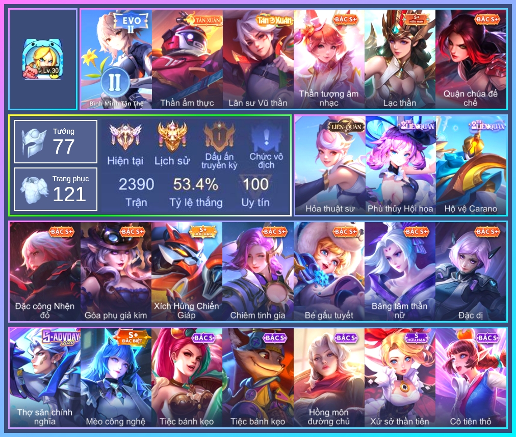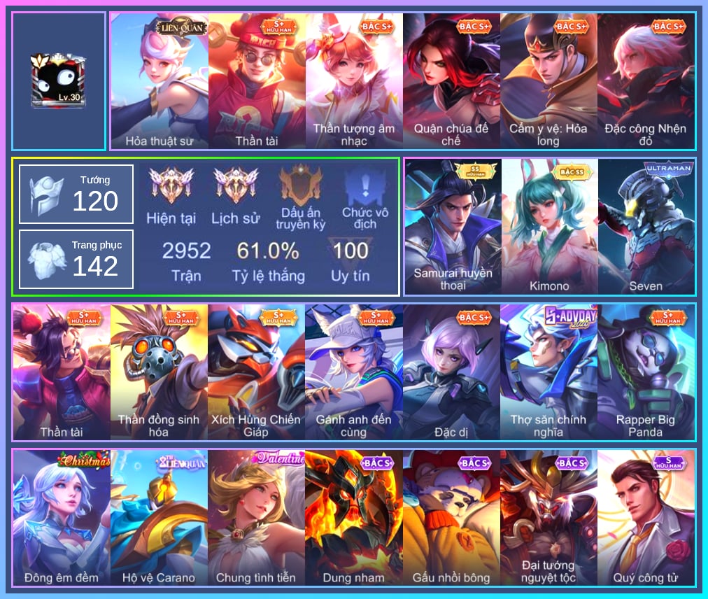 Valhein Hoàng tử Quạ, Valhein Số 7 Thần Sầu, Valhein S-Quang Vinh, Triệu Vân Thần Tài, Krixi Cô Tiên Thỏ, Krixi Thuỷ Thủ, Gildur phượt thủ, Gildur Đại gia học viện, TelAnnas Cảnh Vệ Rừng, Telannas Dạ hội, TelAnnas Quang Vinh, Volkath Dạ Huyết Tộc, Volkath Tư lệnh viễn chinh, Mganga Hề cung đình, Kahlii Siêu đầu bếp, Kahlii Tử điệp, Zephys Phi thương, Teemee Tay đua siêu tốc, Teemee Thịt xiên nướng, Natalya Quý Cô Thủy Tề, Rouie Quang Vinh, Yena Hoạt náo viên, Yena Nữ hoàng thể thao, Yena Nữ cướp biển, Alice Dạ hội, Grakk Thuyền Trưởng Râu Đỏ, Grakk Màu cờ sắc áo, Quillen Trưởng ngoại khoa, Zill Dung nham, Zill Thần mộng mị, Aleister Quỷ soái nguyệt tộc, Fennik Nhà thám hiểm, Fennik Đội đặc nhiệm, Fennik Tay đua F1, Preyta Phi cơ F1, Hayate Bạch lang, Elandorr Phi vụ thế kỷ, Elandorr Học viện Carano, Yorn Thế Tử Nguyệt Tộc, Yorn Soái ca bãi biển, Keera Nghệ sĩ Graffiti, Annette Xứ sở thần tiên, Capheny S-Quang Vinh, Butterfly Teen Nữ Công Nghệ, Lữ Bố Nam Vương, Qi Thiếu nữ mùa xuân, Airi Lễ hội mùa xuân, Violet Nữ đặc cảnh, Violet Đặc Dị, Violet Huy Chương Vàng, Enzo Phẩm chất quý tộc, Enzo Thần thoại Hy Lạp, Richter Quang vinh 2.0, Arthur Siêu sao Cricket, Dirak Quý tộc, Slimz Sứ giả Thiên giới, Errol Stream đến bao giờ, Raz Đại tù trưởng, Murad Thợ Săn Tiền Thưởng, Murad S-Quang Vinh, Veera Goá Phụ, Ata Quang vinh, Ilumia Diva nổi loạn, Ilumia Ngược dòng thời gian, Ngộ Không Đạo tặc, Ngộ Không Đặc vụ băng hầu, Ngộ Không Cổ thần Ai Cập, Bright Kỳ Lân Soái, Florentino Kiếm sĩ Olympic, Florentino Thần thoại Hy Lạp, Aya Điệp viên ký ức, Amily Đặc công nhện đỏ, Amily Hội ám hoàng, Taara Hỏa Ngọc Nữ Đế, Sephera Chiêm tinh gia, Sephera Thủy Liên Hoa, Lauriel Nữ vương học đường 2, Roxie Lễ hội hoa, Roxie Hỏa thuật sư, Ryoma Thợ Săn Tiền Thưởng, Jinna Hỏa nhãn ma vương, Thane Kẻ Hủy Diệt, Thane Mật vụ, Maloch Ác Ma Địa Ngục, Maloch Samurai Tử Sĩ, Maloch Đại ca Mukbang, Zuka Đầu bếp hoàng cung, Zuka Rapper Big Panda, Liliana thần tượng âm nhạc, Azzenka Quang Vinh 2.0