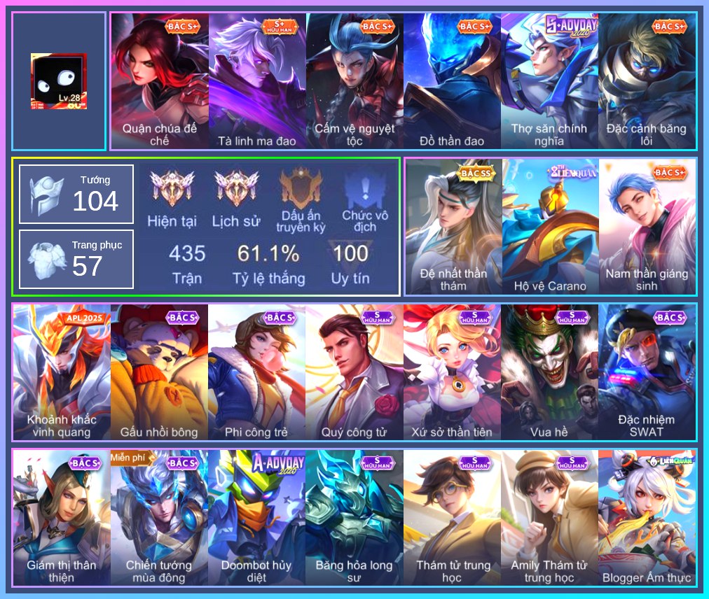 Valhein Hoàng tử Quạ, Valhein Vũ khí tối thượng, Valhein Thần tài, Valhein S-Quang Vinh, Triệu Vân Quý Công Tử, Triệu Vân Thần Tài, Mina Đào tạo siêu sao, Grakk Thuyền Trưởng Râu Đỏ, Gildur phượt thủ, Maloch Samurai Tử Sĩ, Maloch Đại ca Mukbang, Veera Goá Phụ, Yorn Soái ca bãi biển, Annette Xứ sở thần tiên, Preyta Không Tặc, TelAnnas Cảnh Vệ Rừng, Telannas Dạ hội, Omega Hộ Vệ Carano, Murad S-Quang Vinh, Krixi Thuỷ Thủ, Lauriel Nữ vương học đường 2, Hayate Bạch lang, Yena Nữ hoàng thể thao, Celica Tâm hồn trà sữa, Qi Thiếu nữ mùa xuân, Bright Kỳ Lân Soái, Raz Đại tù trưởng, Richter Dạ hội, Richter Quang vinh 2.0, Veres Chị đại học đường, Florentino Thần thoại Hy Lạp, Florentino Hisoka, Enzo Phẩm chất quý tộc, Enzo Thần thoại Hy Lạp, Airi Cấm Vệ Nguyệt Tộc, Airi Đặc công tử điệp, Zill Dung nham, Điêu Thuyền Mèo công nghệ, Sephera Chiêm tinh gia, Stuart Vua hề, Arduin Tà linh hiệp sỹ, Ngộ Không Cổ thần Ai Cập, Zuka Đầu bếp hoàng cung, Zuka Rapper Big Panda, Violet Nữ đặc cảnh, Aya Điệp viên ký ức, Amily Đặc công nhện đỏ, Aleister Quỷ soái nguyệt tộc, Elsu Mafia, Roxie Lễ hội hoa, Roxie Hỏa thuật sư, Taara Hỏa Ngọc Nữ Đế, Quillen Trưởng ngoại khoa, Arum Linh tượng vu nữ, Kriknak Bọ Cánh Bạc, Arthur Siêu sao Cricket, Fennik Nhà thám hiểm, Ilumia Ngược dòng thời gian, Keera Nghệ sĩ Graffiti, Jinna Hỏa nhãn ma vương, Lữ Bố Vũ điệu Samba