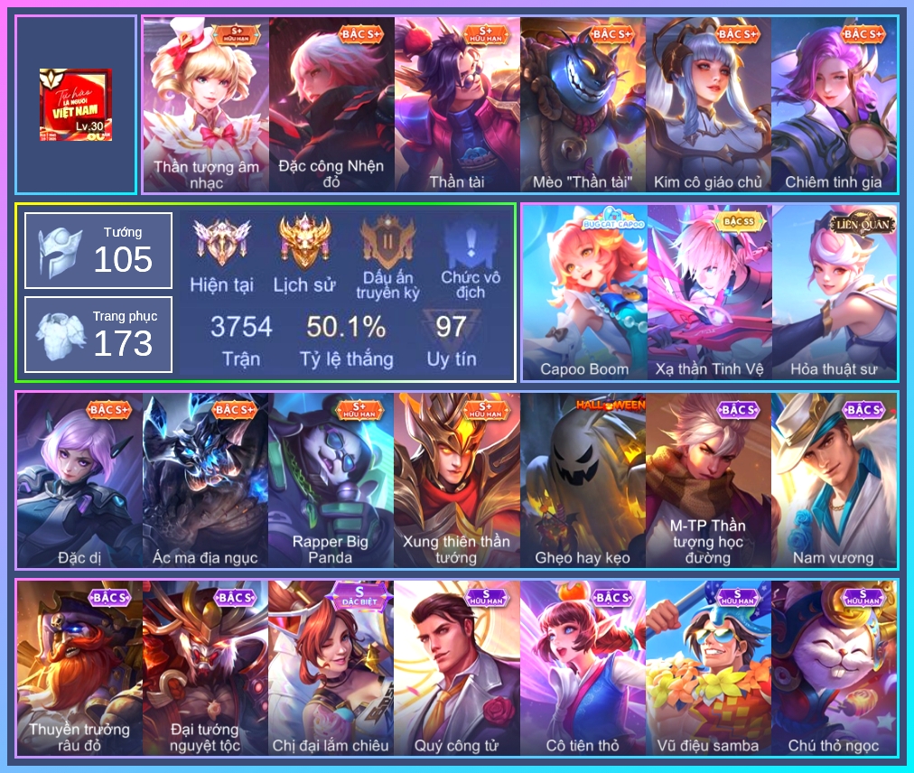 Valhein Hoàng tử Quạ, Valhein Số 7 Thần Sầu, Valhein Khiêu chiến, Valhein Xạ Thần, Valhein S-Quang Vinh, TelAnnas Cảnh Vệ Rừng, TelAnnas Giám thị thân thiện, Telannas Thánh nữ mật hội, Telannas Cẩm y vệ_ Phi Ưng, TelAnnas Quang Vinh, Tel Annas Jujutsu Sorcerer, Arthur Hoàng kim cốt, Arthur Đặc cảnh băng lôi, Arthur Hiệp sĩ trăng khuyết, Krixi Phó văn nghệ, Krixi Thuỷ Thủ, Violet Nữ đặc cảnh, Violet Phi Công Trẻ, Butterfly Teen Nữ Công Nghệ, Butterfly Quận Chúa Đế Chế, Butterfly Gánh anh đến cùng, Triệu Vân Quý Công Tử, Triệu Vân Chiến tướng mùa đông, Triệu Vân Cẩm y vệ_ Hỏa Long, Allain Lân sư Vũ thần, Maloch Ác Ma Địa Ngục, Maloch Đại ca Mukbang, Veera Thiên nga đen, Veera Bách hoa tiên nữ, Stuart Vua hề, Grakk Thuyền Trưởng Râu Đỏ, Grakk Màu cờ sắc áo, Grakk Thần ẩm thực, Volkath Dạ Huyết Tộc, Volkath Tư lệnh viễn chinh, Volkath Quang vinh, Alice Xứ sở thần tiên, Alice Dạ hội, Yorn Đặc Nhiệm Swat, Yorn Long thần soái, Gildur phượt thủ, Gildur Thuyền trưởng râu bạc, Ngộ Không Đạo tặc, Ngộ Không Siêu việt, Ngộ Không Ngộ Khá Trẩu, Ngộ Không Cổ thần Ai Cập, Qi Thiếu nữ mùa xuân, Qi Blogger Ẩm thực, Omega Hộ Vệ Carano, Dextra Quý cô Tuổi Dần, Zephys Dung Nham, Murad Thợ Săn Tiền Thưởng, Murad M-TP Thần Tượng Học Đường, Murad Điệp viên Anubis, Murad S-Quang Vinh, Toro Đặc cảnh NYPD, Toro Ngưu hải vương, Lữ Bố Vũ điệu Samba, KilGroth Cảnh Vệ Biển, Liliana Thuỷ thủ hồ ly, Airi Thích Khách, Airi Cấm Vệ Nguyệt Tộc, Airi Đặc công tử điệp, Lindis Đồng phục Shihakusho, Zill Diệt nguyệt tử sĩ, Zata Tư lệnh viễn chinh, Arduin Tà linh hiệp sỹ, Zip Cá siêu quậy, Zip Vua sân cỏ, Kahlii Siêu đầu bếp, Kahlii Rối Nước Thuỷ Đình, Tulen Phù Thủy Kiến Tạo, Tulen Phó kỷ luật, Yan nhà chế tác, Roxie Lễ hội hoa, Roxie Hỏa thuật sư, Ata Mèo đi mưa, Taara Đại tù trưởng, Taara Hỏa Ngọc Nữ Đế, Slimz Thỏ Thợ Mỏ, Slimz Siêu Cấp Tối Thượng, Richter Quang vinh 2.0, Raz Mãnh lôi thần quyền, Hayate Bạch ảnh, Hayate Quỷ diện, Natalya Nghệ nhân lân, Natalya Quý Cô Thủy Tề, Florentino Giám sát tinh hệ, Florentino Thần thoại Hy Lạp, Florentino S-Quang Vinh, Rouie Quang Vinh, Baldum, Astrid Bạch Kiếm Tiểu Thư, Ignis Thần mặt trời, Kriknak Bọ Cánh Bạc, Kriknak ST.L-162, Veres Đạo tặc, Veres Tiệc bãi biển, Zuka Gấu Nhồi Bông, Mina Tiệc Bánh Kẹo, Capheny Thần tượng âm nhạc, Capheny S-Quang Vinh, Kaine Đôi Cánh Đại Dương, Kaine Người dơi, Max Hiệp Sĩ Nhí, Max Găng Tay Vàng, Quillen Sao đỏ học đường, Quillen Người gác đền, Azzenka Quang Vinh 2.0, Enzo Phẩm chất quý tộc, Enzo Leo núi, Mganga Doombot Hủy Diệt, Amily Đặc công nhện đỏ, Amily Thỏ may mắn, Amily Nữ đội trưởng, Darcy Nam tước, Yena Nữ hoàng thể thao, Yena Nữ cướp biển, Skud Cứu hộ, Thorne Cận vệ hoàng gia, Thorne Ước nguyện giáng sinh, Celica Nữ cao bồi, Celica S-Quang Vinh, Lauriel Nữ vương học đường 2, Fennik Nhà thám hiểm, Bright Soái ca thánh điện, Bright Kỳ Lân Soái, Nakroth Quân đoàn địa ngục, Nakroth Producer Tia chớp, Aya Điệp viên ký ức, Sinestrea Đại tiểu thư 2, Sinestrea S-Quang vinh, Tachi Đao khách vô tình, Keera Nghệ sĩ Graffiti, Caesar Bão tố, Bonnie S Quang Vinh