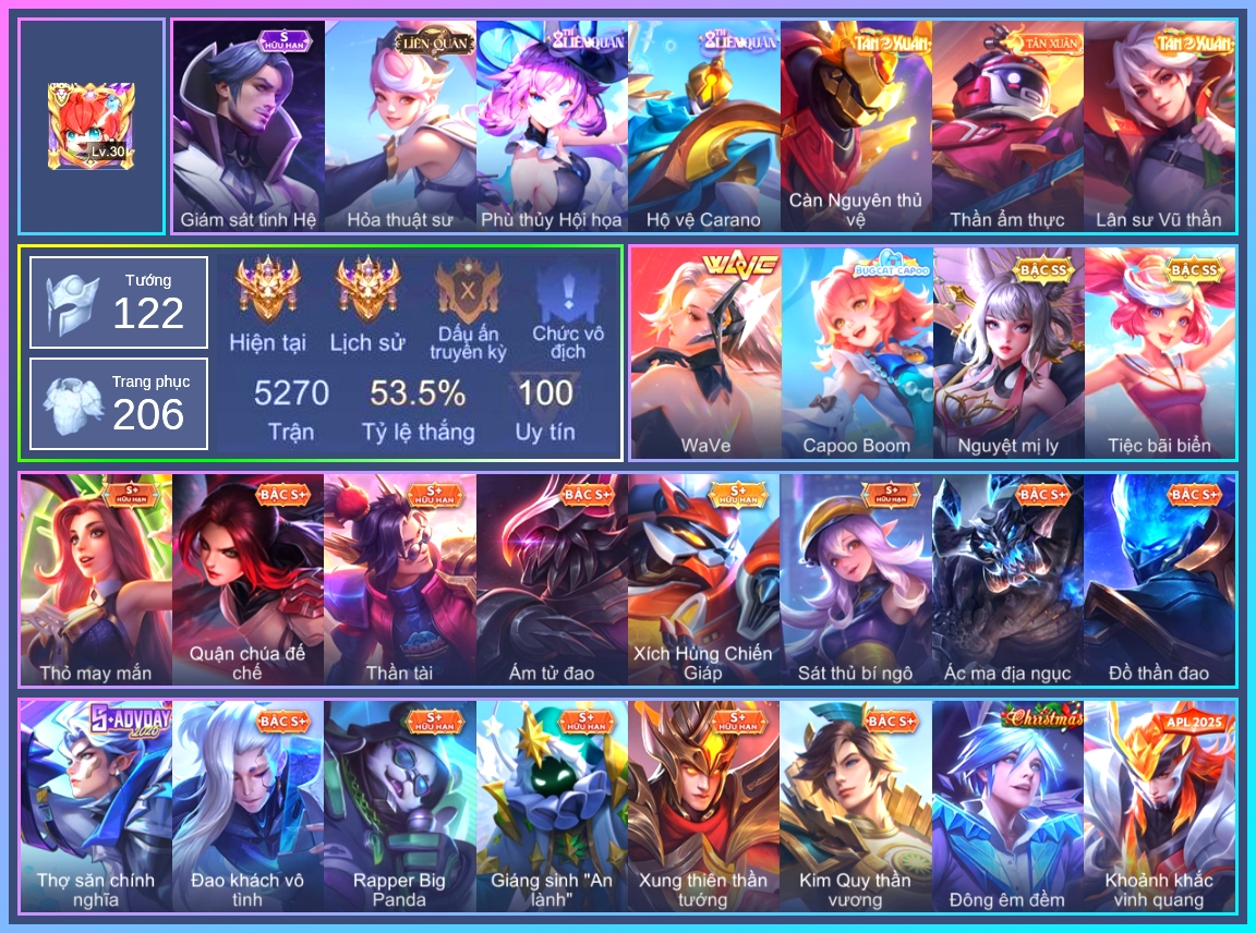 Valhein Hoàng tử Quạ, Valhein Khiêu chiến, Valhein Xạ Thần, Valhein S-Quang Vinh, Triệu Vân Thần Tài, Mganga Hề cung đình, Mganga Doombot Hủy Diệt, Krixi Tiệc Bãi Biển, Krixi Thuỷ Thủ, Grakk Thuyền Trưởng Râu Đỏ, Grakk Khô Lâu Đại Tướng, Grakk Thần ẩm thực, Butterfly Teen Nữ Công Nghệ, Butterfly Quận Chúa Đế Chế, Butterfly Bình Minh Tận Thế, Maloch Ác Ma Địa Ngục, Maloch Ác nhân vô tuyến, Maloch Đại ca Mukbang, Wisp Ếch nhồi bông, Toro Đặc cảnh NYPD, Toro Ngưu hải vương, Annette Băng kỳ lâm, Preyta Không Tặc, Teemee Thịt xiên nướng, Teemee Giấc Mơ Ngọt Ngào, Gildur phượt thủ, Gildur Đại gia học viện, Skud Sơn Tặc, Lumburr, Arduin, Arduin Tà linh hiệp sỹ, Arduin Nhà vô địch, Amily Hội ám hoàng, Amily Thám tử trung học, Kaine Người dơi, Kaine Thợ Săn Chính Nghĩa, Lindis Đồng phục Shihakusho, Veera Phù thủy Hội họa, Kahlii Siêu đầu bếp, Kahlii Tử điệp, Kahlii Rối Nước Thuỷ Đình, Zephys Phi thương, Zephys Inosuke Hashibira, Tulen Nhà Thám Hiểm, Tulen Đông êm đềm, Tulen Phó kỷ luật, TelAnnas Cảnh Vệ Rừng, TelAnnas Giám thị thân thiện, Telannas Thánh nữ mật hội, Telannas Dạ hội, TelAnnas Quang Vinh, Tel Annas Jujutsu Sorcerer, Murad Thợ Săn Tiền Thưởng, Murad M-TP Thần Tượng Học Đường, Murad Đồ thần đao, Murad S-Quang Vinh, Nakroth Chiến Binh Hỏa Ngục, Nakroth Producer Tia chớp, Nakroth Siêu Việt 1, Elsu Cảnh vệ thảo nguyên, Elsu Tuyết ưng, Mina Tiệc Bánh Kẹo, Taara Hỏa Ngọc Nữ Đế, Zuka Phát Tài, Zuka Đầu bếp hoàng cung, Zuka Rapper Big Panda, Zuka Xích Hùng Chiến Giáp, Điêu Thuyền Nữ Vương Anh Đào, Điêu Thuyền Nữ y tá, Raz Đại tù trưởng, Raz Saitama Cosplay, Omega Người máy xanh, Omega Cỗ Máy Siêu Tốc, Omega Hộ Vệ Carano, Airi Thích Khách, Airi Đặc công tử điệp, Ata Mèo đi mưa, Kriknak Bọ Cánh Bạc, Azzenka Quang Vinh 2.0, AzzenKa Giáng sinh An lành, Zata Tư lệnh viễn chinh, Florentino Giám sát tinh hệ, Florentino Kiếm sĩ Olympic, Florentino Thần thoại Hy Lạp, Florentino Hisoka, Florentino S-Quang Vinh, KilGroth Cảnh Vệ Biển, KilGroth Càn Nguyên Thủ Vệ, Yorn Soái ca bãi biển, Tachi Lãng khách, Tachi S-Vinh Quang, Tachi Đao khách vô tình, Ryoma Dạ hội, Ryoma Ailing Samurai, Violet Nữ đặc cảnh, Violet Tay Súng Siêu Phẩm, Violet Huy Chương Vàng, Qi Quán quân, Qi Thiếu nữ pháo hoa, Qi Blogger Ẩm thực, Zill Lốc Địa Ngục, Zill Thần mộng mị, Dextra Quý cô Tuổi Dần, Allain Lân sư Vũ thần, Dirak Cảnh Vệ Bầu Trời, Dirak Đường chủ yêu giới, Hayate Bạch ảnh, Hayate Bạch lang, Bright Soái ca thánh điện, Bright Kỳ Lân Soái, Astrid Bạch Kiếm Tiểu Thư, Astrid Hoa anh đào, Krizzix Crursed Corpse, Ngộ Không Đạo tặc, Ngộ Không Cổ thần Ai Cập, Volkath Dạ Huyết Tộc, Volkath Xung thiên thần tướng, Volkath Tư lệnh viễn chinh, Volkath Quang vinh, Yan Giấc mơ sao, Roxie Cháy Phố, Roxie Lễ hội hoa, Roxie Hỏa thuật sư, Alice Xứ sở thần tiên, Alice The Butterfly Mansion Girl, Lữ Bố Nam Vương, Lữ Bố Vũ điệu Samba, Richter Dạ hội, Richter Quang vinh 2.0, Richter Cứu hộ, Errol Diệt nguyệt tiên phong, Errol Stream đến bao giờ, Liliana Nguyệt mị ly, Liliana Thuỷ thủ hồ ly, Yena Thỏ may mắn, Yena Nữ hoàng thể thao, Yena Nữ cướp biển, Yena WaVe, Veres Đạo tặc, Veres Chị đại học đường, Xeniel Thiên Sứ Hủy Diệt, Xeniel Shipper bánh mỳ, Arum Linh tượng vu nữ, Arum Thần tượng nhạc Rock, Fennik Nhà thám hiểm, Fennik Đội đặc nhiệm, Fennik Tiệc Bánh Kẹo, Fennik Shipper Siêu thanh, Laville Kim quy thần vương, Laville Thám tử học đường, Keera Học viên Carano, Keera Sát thủ bí ngô, Keera Thuỷ thủ, Keera Nghệ sĩ Graffiti, Keera Hồ điệp, Slimz Thỏ Thợ Mỏ, Slimz Lẩu chua cay, Slimz Sứ giả Thiên giới, Slimz Siêu Cấp Tối Thượng, Baldum, Baldum Đồ chơi, Thane Kẻ Hủy Diệt, Thane Mật vụ, Thane Khoảnh khắc vinh quang, Rourke Pháo Thủ Tuộc Neo, Rourke Cuồng tặc, Capheny Hầu gái, Capheny S-Quang Vinh, Rouie Quang Vinh, Celica Nữ cao bồi, Celica S-Quang Vinh, Stuart Gã hề, Elandorr Soái tặc, Elandorr Phi vụ thế kỷ, Elandorr Học viện Carano, Sephera Phi vụ thế kỷ, Sephera Thủy Liên Hoa, Enzo Chiến binh trăng khuyết, Enzo Thần thoại Hy Lạp, Thorne Ước nguyện giáng sinh, Thorne Thám tử trung học, Lauriel Nữ vương học đường 2, Aleister Thiếu Niên Hắc Ám, Zip Ông trùm giáng sinh, Ignis Bắc băng vương, Ignis Nguyệt lão, Ignis Vì sao con khóc, Omen Ám tử đao, Omen Thuyền trưởng hải tặc, Ilumia Nữ Chúa Tuyết, Ilumia Diva nổi loạn, Ilumia Ngược dòng thời gian, Ybneth Hạt trưởng kiểm lâm, Ybneth Candy Bear, Sinestrea Đại tiểu thư 1, Sinestrea Lữ khách sa mạc, Sinestrea S-Quang vinh, Quillen Huyết phong, Dolia Môn đồ tập sự, Caesar Bão tố, Max Chuyên gia đập hộp, Max Trà Chanh, Jinna Hỏa nhãn ma vương, Ishar Capoo Boom, Marja Linh Xà Tư Tế, Bonnie S Quang Vinh