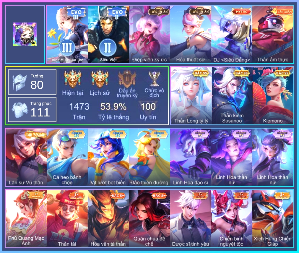 Arthur Lãnh chúa xương, Arthur Siêu sao Cricket, Arthur Đặc cảnh băng lôi, Krixi Xứ Sở Thần Tiên, Krixi Phó văn nghệ, Krixi Thuỷ Thủ, TelAnnas Giám thị thân thiện, Telannas Thánh nữ mật hội, Telannas Dạ hội, Tel Annas Jujutsu Sorcerer, Valhein Hoàng tử Quạ, Valhein Hoàng tử Băng, Valhein Thần tài, Lữ Bố Hoả Long Chiến Thần, Violet Tay Súng Siêu Phẩm, Violet Huy Chương Vàng, Violet Thần long tỷ tỷ, Butterfly Quận Chúa Đế Chế, Butterfly Gánh anh đến cùng, Butterfly Bình Minh Tận Thế, Fennik Nhà thám hiểm, Fennik Tiệc Bánh Kẹo, Triệu Vân Quý Công Tử, Allain Lân sư Vũ thần, Maloch Ác Ma Địa Ngục, Maloch Ác nhân vô tuyến, Maloch Đại ca Mukbang, Stuart Vua hề, Alice bé du xuân, Grakk Thần ẩm thực, Richter Kiếm thần Susanoo, Richter Quang vinh 2.0, Ngộ Không Đạo tặc, Ngộ Không Cổ thần Ai Cập, Slimz Linh Hoa đạo sĩ, Kahlii Kim cô giáo chủ, Kahlii Linh Hoa thần nữ, Mganga Doombot Hủy Diệt, Toro Trung Phong Cắm, Toro Ngưu hải vương, Amily Thám tử trung học, Taara Hỏa Ngọc Nữ Đế, Taara Tư lệnh hải âu, Roxie Hỏa thuật sư, Azzenka Quang Vinh 2.0, AzzenKa Giáng sinh An lành, Aya Điệp viên ký ức, Aya Thủy thủ, Errol Diệt nguyệt tiên phong, Errol Quái vật cương thi, Errol Stream đến bao giờ, Zuka Đại Phú Ông, Zuka Phát Tài, Zuka Gấu Nhồi Bông, Zuka Xích Hùng Chiến Giáp, Yena Chiến binh nguyệt tộc, Nakroth Quán quân, Nakroth Producer Tia chớp, Nakroth Siêu Việt 1, Tachi S-Vinh Quang, Kaine Thợ Săn Chính Nghĩa, Veres Thần thoại Hy Lạp, Capheny Hầu gái, Capheny Quân Nhạc Mildar, Capheny S-Quang Vinh, Tulen Phó kỷ luật, Liliana Tiệc bãi biển, Florentino S-Quang Vinh, Keera Nghệ sĩ Graffiti, Keera Hồ điệp, Annette Xứ sở thần tiên, Quillen Trưởng ngoại khoa, Sinestrea S-Quang vinh, Enzo Phẩm chất quý tộc, Enzo Leo núi, Enzo Cá Heo Bảnh Choẹ, Thorne Ước nguyện giáng sinh, Thorne Thám tử trung học, Dolia Môn đồ tập sự, Volkath Quang vinh, Hayate Ngân lang, Elsu Tuyết ưng, Elsu DJ Siêu Đẳng, Murad M-TP Thần Tượng Học Đường, Murad Đồ thần đao, Murad Dược Sĩ Tình yêu, Mina Lưỡi hái hoàng kim, Raz Băng Quyền Quán Quân, Lindis Linh Hoa thần nữ, Astrid Hoa anh đào, Thane Mật vụ, Thane Khoảnh khắc vinh quang, Krizzix Crursed Corpse, Zephys Đầu bếp Sashimi, Qi Búp bê Daruma, Celica Vịt lướt bọt biển, Dextra Đảo thiên đường, Lorion Hoả vân tà thần, Teemee Giấc Mơ Ngọt Ngào, Lumburr Golem thảo nguyên, Marja Linh Xà Tư Tế, Marja Phù Quang Mạc Ảnh, Airi Kiemono, Max Trà Chanh, Iggy Bạch hồ ly, Bonnie S Quang Vinh, Laville Tay súng diệt thần, Ryoma Dạ hội, Caesar Bão tố, Ignis Vì sao con khóc, Ybneth Candy Bear