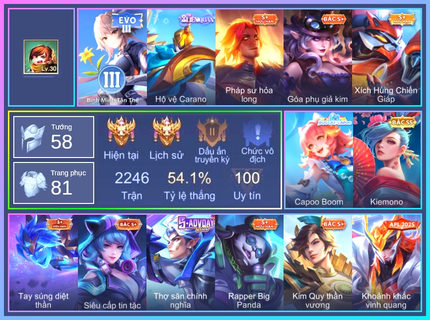 Valhein Hoàng tử Quạ, Valhein S-Quang Vinh, Triệu Vân Quý Công Tử, Krixi Xứ Sở Thần Tiên, Krixi Phó văn nghệ, TelAnnas Cảnh Vệ Rừng, TelAnnas Giám thị thân thiện, Telannas Thánh nữ mật hội, Telannas Dạ hội, TelAnnas Quang Vinh, Mganga Doombot Hủy Diệt, Toro Trung Phong Cắm, Veera Goá Phụ, Zuka Gấu Nhồi Bông, Zuka Rapper Big Panda, Zuka Xích Hùng Chiến Giáp, Taara Hỏa Ngọc Nữ Đế, Zephys Đầu bếp Sashimi, Yorn Cung thủ bóng đêm, Thorne Cận vệ hoàng gia, Thorne Thám tử trung học, Kahlii Rối Nước Thuỷ Đình, Omega Hộ Vệ Carano, Preyta Phi cơ F1, Grakk Màu cờ sắc áo, Darcy Pháp sư hỏa long, Capheny Hầu gái, Capheny Siêu cấp tin tặc, Laville Tay đua đường phố, Laville Tay súng diệt thần, Laville Tay súng vô địch, Laville Kim quy thần vương, Violet Phó học tập, Violet Tay Súng Siêu Phẩm, Maloch Tiệc hóa trang, Sinestrea S-Quang vinh, Sephera Phi vụ thế kỷ, Butterfly Bình Minh Tận Thế, Hayate Bạch ảnh, Ishar Giấc Mơ Ngọt Ngào, Ishar Tiểu thư gấu trúc, Ishar Tiểu Thư, Ishar Capoo Boom, Ignis Vì sao con khóc, Dirak Ông bầu Showbiz, Max Tiểu King Kong, Max Trà Chanh, Ata Quang vinh, Zill Dung nham, Zill Thần mộng mị, Alice Xứ sở thần tiên, Aleister Quỷ soái nguyệt tộc, Astrid Bạch Kiếm Tiểu Thư, Amily Hội ám hoàng, Amily Thám tử trung học, Florentino S-Quang Vinh, Murad S-Quang Vinh, Richter Quang vinh 2.0, Tachi Đao khách vô tình, Azzenka Ghẹo hay kẹo, Arthur Siêu sao Cricket, Ngộ Không Đạo tặc, Annette Xứ sở thần tiên, Bright Soái ca thánh điện, Bright Kỳ Lân Soái, Aya Thủy thủ, Marja Linh Xà Tư Tế, Volkath Quang vinh, Teeri Tiểu kì lân, Wisp Ếch nhồi bông, Airi Kiemono, Airi Đặc công tử điệp, Teemee Giấc Mơ Ngọt Ngào, Kaine Thợ Săn Chính Nghĩa, Quillen Trưởng ngoại khoa, Enzo Phẩm chất quý tộc, Thane Khoảnh khắc vinh quang, Bonnie S Quang Vinh, Celica Tâm hồn trà sữa, Ryoma Dạ hội, Ybneth Candy Bear