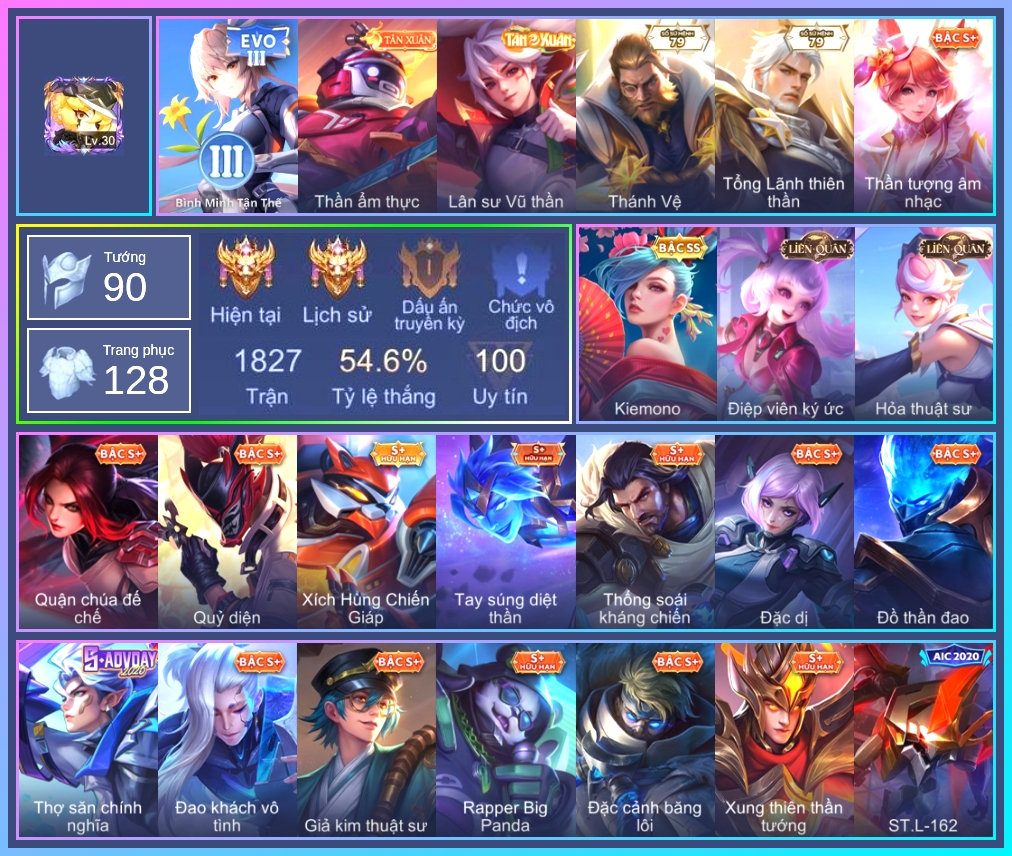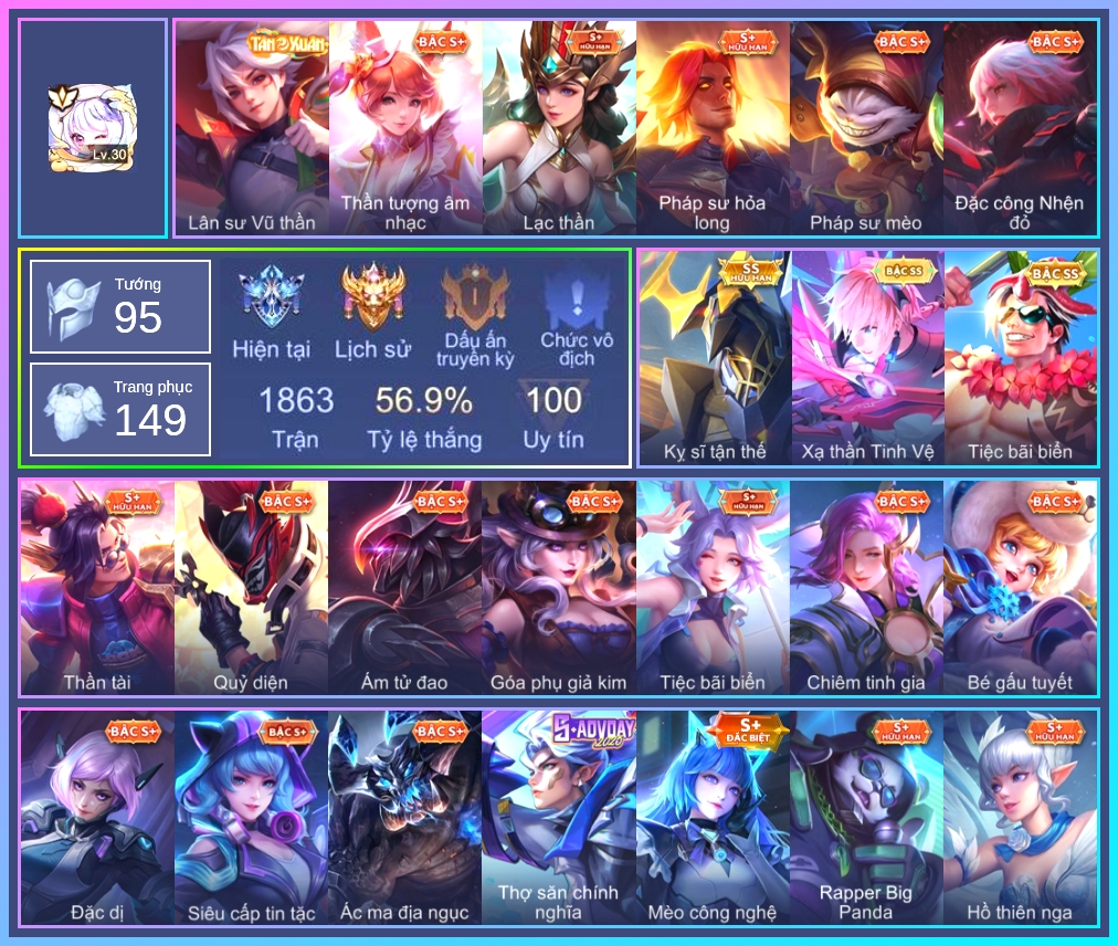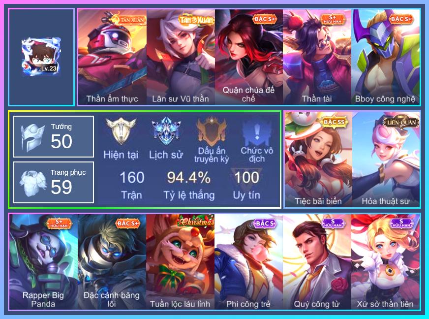 Arthur Siêu sao Cricket, Arthur Đặc cảnh băng lôi, Krixi Phó văn nghệ, TelAnnas Giám thị thân thiện, Telannas Thánh nữ mật hội, Telannas Dạ hội, Valhein Hoàng tử Quạ, Valhein Số 7 Thần Sầu, Violet Phó học tập, Violet Đặc Dị, Violet Tay Súng Siêu Phẩm, Violet Huy Chương Vàng, Aleister Quỷ soái nguyệt tộc, Lữ Bố Hoả Long Chiến Thần, Lữ Bố Vũ điệu Samba, Zuka Đại Phú Ông, Zuka Gấu Nhồi Bông, Zuka Đầu bếp hoàng cung, Zuka Rapper Big Panda, Zuka Xích Hùng Chiến Giáp, Zephys Phi thương, Zephys Đầu bếp Sashimi, Kriknak Bọ Cánh Bạc, Kriknak ST.L-162, Elsu Tuyết ưng, Zata Tư lệnh viễn chinh, Butterfly Quận Chúa Đế Chế, Butterfly Bình Minh Tận Thế, Alice Dạ hội, Gildur Thuyền trưởng râu bạc, Triệu Vân Quý Công Tử, Triệu Vân Chiến tướng mùa đông, Allain Lân sư Vũ thần, Yorn Đặc Nhiệm Swat, Yorn Lục nguyệt cung, Yorn Soái ca bãi biển, Maloch Samurai Tử Sĩ, Maloch Đại ca Mukbang, Florentino Thần thoại Hy Lạp, Florentino S-Quang Vinh, Rourke Thợ cơ khí, Rourke Thánh Vệ, Veera Thiên nga đen, Stuart Vua hề, Ngộ Không Cổ thần Ai Cập, Grakk Thuyền Trưởng Râu Đỏ, Grakk Thần ẩm thực, Laville Tay đua đường phố, Laville Tay súng diệt thần, Laville Thám tử học đường, Azzenka Ghẹo hay kẹo, Azzenka Quang Vinh 2.0, Kahlii Siêu đầu bếp, Mganga Quái tặc không gian, Mganga Doombot Hủy Diệt, Nakroth Producer Tia chớp, Nakroth Siêu Việt 1, Baldum Đồ chơi, Murad M-TP Thần Tượng Học Đường, Murad Đồ thần đao, Murad Điệp viên Anubis, Murad S-Quang Vinh, Thane Mật vụ, Celica S-Quang Vinh, Liliana Hồ Quý Phi, Liliana thần tượng âm nhạc, Arduin, Raz Đại tù trưởng, Raz Saitama Cosplay, Raz MC Võ đài, Fennik Nhà thám hiểm, Fennik Đội đặc nhiệm, Fennik Tay đua F1, Elandorr Soái tặc, Elandorr Học viện Carano, Mina Đào tạo siêu sao, Richter Thống soái kháng chiến, Richter Quang vinh 2.0, Richter Tổng Lãnh Thiên Thần, Zill Thần mộng mị, Volkath Dạ Huyết Tộc, Volkath Xung thiên thần tướng, Volkath Tư lệnh viễn chinh, Volkath Quang vinh, Kaine Thợ Săn Chính Nghĩa, Quillen Trưởng ngoại khoa, Tulen Dạ hội, Airi Kiemono, Airi Đặc công tử điệp, Ybneth Candy Bear, Roxie Hỏa thuật sư, Aya Điệp viên ký ức, Bright Soái ca thánh điện, Bright Khiêu chiến, Thorne Giả kim thuật sư, Ming thầy tướng, Ilumia Nữ Chúa Tuyết, Sinestrea Lữ khách sa mạc, Sinestrea S-Quang vinh, Zip Ông trùm giáng sinh, Slimz Thỏ nhồi bông, Slimz Lẩu chua cay, Slimz Siêu Cấp Tối Thượng, Erin Mộc tinh linh, Tachi S-Vinh Quang, Tachi Đao khách vô tình, Yan nhà chế tác, Yan Giấc mơ sao, Capheny Hầu gái, Capheny S-Quang Vinh, Dextra Lữ khách cao nguyên, Taara Hỏa Ngọc Nữ Đế, Taara Tư lệnh hải âu, Yena Nữ hoàng thể thao, Ryoma Dạ hội, Xeniel Kim sí điểu, Arum Thần tượng nhạc Rock, Ignis Hỏa Thuật Sư, Bonnie S Quang Vinh, Enzo Phẩm chất quý tộc, Enzo Thần thoại Hy Lạp, Max Hiệp Sĩ Nhí, Max Trà Chanh, Hayate Quỷ diện, KilGroth Cảnh Vệ Biển, Errol Vượt ngục, Marja Linh Xà Tư Tế, Wisp Hải Tặc Nhí