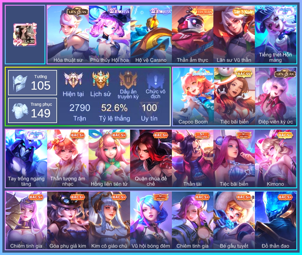 Valhein Hoàng tử Quạ, Valhein Xạ Thần, Valhein S-Quang Vinh, Triệu Vân Thần Tài, Krixi Xứ Sở Thần Tiên, Krixi Cô Tiên Thỏ, Krixi Hồ Thiên Nga, Krixi Thuỷ Thủ, Mina Tiệc Bánh Kẹo, Mina Đào tạo siêu sao, TelAnnas Cảnh Vệ Rừng, Telannas Dạ hội, TelAnnas Quang Vinh, Tel Annas Jujutsu Sorcerer, Mganga Doombot Hủy Diệt, Grakk Thuyền Trưởng Râu Đỏ, Grakk Khô Lâu Đại Tướng, Grakk Màu cờ sắc áo, Grakk Thần ẩm thực, Butterfly Teen Nữ Công Nghệ, Butterfly Quận Chúa Đế Chế, Errol Stream đến bao giờ, Gildur Đại gia học viện, Kahlii Kim cô giáo chủ, Kahlii Siêu đầu bếp, Kahlii Tử điệp, Maloch Samurai Tử Sĩ, Maloch Ác nhân vô tuyến, Wisp Hải Tặc Nhí, Annette Nữ sinh trung học, Raz Đại tù trưởng, Raz Saitama Cosplay, Veera Goá Phụ, Veera Vũ hội bóng đêm, Veera Kimono, Veera Phù thủy Hội họa, Preyta Không Tặc, TeeMee Xiếc Cung Đình, Yorn Soái ca bãi biển, Florentino Thần thoại Hy Lạp, Florentino Hisoka, Florentino S-Quang Vinh, Zephys Đầu bếp Sashimi, Arduin, Taara Đại tù trưởng, Taara Hỏa Ngọc Nữ Đế, Amily Hội ám hoàng, Amily Thám tử trung học, Stuart Vua hề, Toro Bạch mao Ngưu, Toro Ngưu hải vương, Arum Thú Vệ Cổ Mộ, Arum Linh tượng vu nữ, Arum Nữ hoàng gấu xám, Arum Thần tượng nhạc Rock, Ngộ Không Cổ thần Ai Cập, Nakroth Producer Tia chớp, Violet Nữ đặc cảnh, Violet Tay Súng Siêu Phẩm, Violet Huy Chương Vàng, Hayate Bạch ảnh, Hayate Bạch lang, Sephera Quý tiểu thư, Sephera Chiêm tinh gia, Sephera Thủy Liên Hoa, Kriknak Bọ Cánh Bạc, Dextra Chiến binh quyến rũ, Dextra Lữ khách cao nguyên, Iggy Bạch hồ ly, Iggy Tiếng thét Hỗn mang, Tachi Đao khách vô tình, Thane Kẻ Hủy Diệt, Ryoma Thợ Săn Tiền Thưởng, Ryoma Dạ hội, Ryoma Ailing Samurai, Yena Hoạt náo viên, Yena Nữ hoàng thể thao, Yena Nữ cướp biển, Zill Lốc Địa Ngục, Zill Thần mộng mị, Ishar Capoo Boom, Liliana thần tượng âm nhạc, Liliana Thuỷ thủ hồ ly, Natalya Quý Cô Thủy Tề, Alice Nhà chiêm tinh, Alice Bé Gấu Tuyết, Alice Xứ sở thần tiên, Alice Dạ hội, Alice The Butterfly Mansion Girl, Rouie Sứ giả vũ trụ, Rouie Quang Vinh, Điêu Thuyền Nữ Vương Anh Đào, Điêu Thuyền Tiệc bãi biển, Qi Blogger Ẩm thực, Murad Đồ thần đao, Murad S-Quang Vinh, Wonder Woman Thế Chiến, Capheny S-Quang Vinh, Aya Điệp viên ký ức, Slimz Lẩu chua cay, Slimz Sứ giả Thiên giới, Slimz Siêu Cấp Tối Thượng, Omen Thuyền trưởng hải tặc, Zuka Đầu bếp hoàng cung, Zuka Rapper Big Panda, Ilumia Nữ Chúa Tuyết, Ilumia Diva nổi loạn, Ilumia Ngược dòng thời gian, Tulen Dạ hội, Keera Học viên Carano, Keera Hồ điệp, Laville Thám tử học đường, Arthur Hoàng kim cốt, Lauriel Đọa Lạc Thiên Sứ, Lauriel Tiệc bãi biển, Lauriel Nữ vương học đường 2, Fennik Đội đặc nhiệm, Rourke Thợ cơ khí, Helen Hồng Liên tiên tử, Richter Quang vinh 2.0, Richter Cứu hộ, Ybneth Candy Bear, Bright Kỳ Lân Soái, Roxie Hỏa thuật sư, Airi Đặc công tử điệp, Kaine Thợ Săn Chính Nghĩa, Max Hiệp Sĩ Nhí, Azzenka Quang Vinh 2.0, Sinestrea Lữ khách sa mạc, Sinestrea S-Quang vinh, Baldum, Baldum Đồ chơi, Lindis Thám Tử Tư, Volkath Xung thiên thần tướng, Volkath Tư lệnh viễn chinh, Yue Chiêm Tinh gia, Veres Đạo tặc, Xeniel Shipper bánh mỳ, Xeniel Tay trống ngang tàng, Elandorr Học viện Carano, Celica S-Quang Vinh, Celica Tâm hồn trà sữa, Yan Giấc mơ sao, Enzo Leo núi, Bonnie S Quang Vinh, Quillen Huyết phong, Omega Hộ Vệ Carano, Allain Lân sư Vũ thần, KilGroth Cảnh Vệ Biển