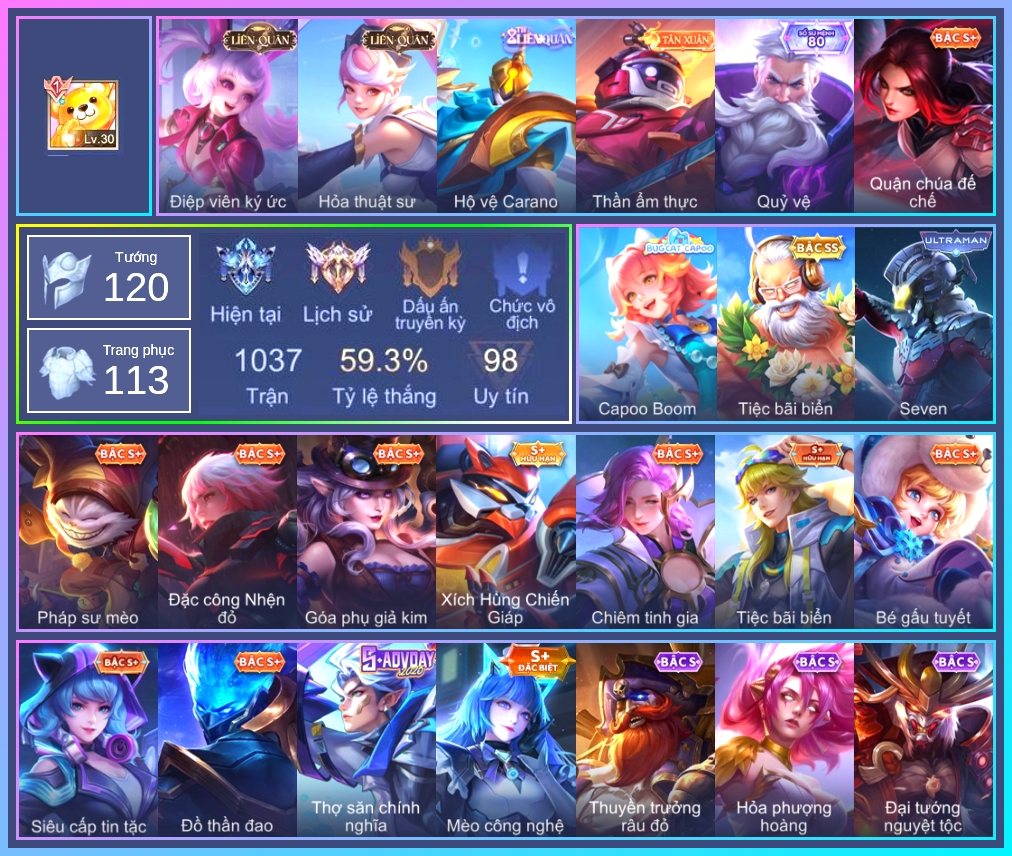 Arthur Siêu sao Cricket, Arthur Đặc cảnh băng lôi, Krixi Phó văn nghệ, TelAnnas Giám thị thân thiện, Valhein Hoàng tử Quạ, Butterfly Quận Chúa Đế Chế, Butterfly Bình Minh Tận Thế, Violet Phó học tập, Violet Huy Chương Vàng, Alice Dạ hội, Yorn Đặc Nhiệm Swat, Triệu Vân Thần Tài, Omen Sĩ Quan Viễn Chinh, Ming thầy tướng, Maloch Đại Tướng Robot, Errol Dị Nhân Tinh Hệ, Veera Goá Phụ, Murad Thợ Săn Tiền Thưởng, Murad Đồ thần đao, Stuart Vua hề, Xeniel Kim sí điểu, Liliana Hồ Quý Phi, Moren Thợ Cắt Cáp, Grakk Khô Lâu Đại Tướng, Grakk Màu cờ sắc áo, Thorne Giả kim thuật sư, Florentino S-Quang Vinh, Ngộ Không Đạo tặc, Gildur Thuyền trưởng râu bạc, Lindis Dạ tiệc, Kahlii Rối Nước Thuỷ Đình, Ilumia Ngược dòng thời gian, Zuka Đại Phú Ông, Mganga Doombot Hủy Diệt, Raz Đại tù trưởng, Nakroth Siêu Việt 1, Lữ Bố Hoả Long Chiến Thần, Baldum thần thoại hy lạp, Kaine Thợ Săn Chính Nghĩa, KilGroth Cảnh Vệ Biển