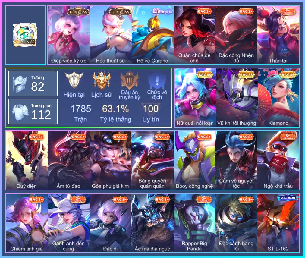 Valhein Vũ khí tối thượng, Valhein Số 7 Thần Sầu, Valhein S-Quang Vinh, TelAnnas Giám thị thân thiện, TelAnnas Quang Vinh, Tel Annas Jujutsu Sorcerer, Arthur Hoàng kim cốt, Arthur Siêu sao Cricket, Arthur Đặc cảnh băng lôi, Krixi Cô Tiên Thỏ, Krixi Phó văn nghệ, Krixi Thuỷ Thủ, Lữ Bố Kỵ Sĩ Âm Phủ, Lữ Bố Vũ điệu Samba, Butterfly Teen Nữ Công Nghệ, Butterfly Nữ Quái Nổi Loạn, Butterfly Quận Chúa Đế Chế, Butterfly Gánh anh đến cùng, Violet Phi Công Trẻ, Violet Đặc Dị, Violet Huy Chương Vàng, Natalya Quý Cô Thủy Tề, Triệu Vân Quý Công Tử, Triệu Vân Thần Tài, Alice Xứ sở thần tiên, Alice The Butterfly Mansion Girl, Maloch Ác Ma Địa Ngục, Veera Goá Phụ, Omen Ám tử đao, Omen Thuyền trưởng hải tặc, Stuart Vua hề, Stuart Gã hề, Grakk Thuyền Trưởng Râu Đỏ, Grakk Khô Lâu Đại Tướng, Arum Nữ hoàng gấu xám, Mina Tiểu thư đoạt hồn, Zuka Gấu Nhồi Bông, Zuka Đầu bếp hoàng cung, Zuka Rapper Big Panda, Laville Tay đua đường phố, Gildur phượt thủ, Gildur Đại gia học viện, Yorn Đặc Nhiệm Swat, Arduin, Arduin Tà linh hiệp sỹ, Toro Đặc cảnh NYPD, Amily Đặc công nhện đỏ, Amily Hội ám hoàng, Amily Nữ đội trưởng, Ngộ Không Đạo tặc, Ngộ Không Ngộ Khá Trẩu, Ngộ Không Nhóc tỳ bá đạo, Airi Thích Khách, Airi Cấm Vệ Nguyệt Tộc, Airi Kiemono, Nakroth BBoy công nghệ, Nakroth Quán quân, Florentino Thần thoại Hy Lạp, Ata Mèo đi mưa, Lindis Đồng phục Shihakusho, Qi Thiếu nữ pháo hoa, Qi Blogger Ẩm thực, Bright Kỳ Lân Soái, Zip Cá siêu quậy, Ryoma Thợ Săn Tiền Thưởng, Mganga Doombot Hủy Diệt, Thane Kẻ Hủy Diệt, Thane Mật vụ, Enzo Phẩm chất quý tộc, Enzo Thần thoại Hy Lạp, Enzo Leo núi, Tulen Phù Thủy Kiến Tạo, Tulen Dạ hội, Taara Hỏa Ngọc Nữ Đế, Raz Đại tù trưởng, Raz Băng Quyền Quán Quân, Roxie Lễ hội hoa, Roxie Hỏa thuật sư, Hayate Quỷ diện, Hayate Bạch lang, Omega Hộ vệ ba bích, Omega Hộ Vệ Carano, Errol Stream đến bao giờ, Murad Thợ Săn Tiền Thưởng, Murad S-Quang Vinh, Richter Bá tước, Richter Quang vinh 2.0, Kahlii Siêu đầu bếp, Sephera Chiêm tinh gia, Sephera Thủy Liên Hoa, Ilumia Ngược dòng thời gian, Slimz Xứ sở thần tiên, Slimz Sứ giả Thiên giới, Fennik Nhà thám hiểm, Fennik Shipper Siêu thanh, Ignis Bắc băng vương, Celica S-Quang Vinh, Celica Tâm hồn trà sữa, KilGroth Cảnh Vệ Biển, Aya Điệp viên ký ức, Capheny S-Quang Vinh, Kaine Đôi Cánh Đại Dương, Kaine Người dơi, Zill Thần mộng mị, Azzenka Quang Vinh 2.0, Dirak Cảnh Vệ Bầu Trời, Dirak Đường chủ yêu giới, Keera Nghệ sĩ Graffiti, Kriknak ST.L-162, Max Hiệp Sĩ Nhí, Annette Xứ sở thần tiên, Sinestrea S-Quang vinh