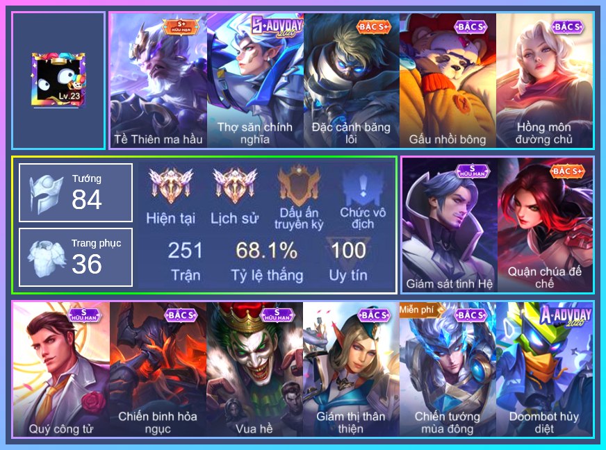 Arthur Siêu sao Cricket, Arthur Đặc cảnh băng lôi, Krixi Phó văn nghệ, TelAnnas Giám thị thân thiện, Telannas Thánh nữ mật hội, Telannas Dạ hội, Valhein Số 7 Thần Sầu, Butterfly Quận Chúa Đế Chế, Violet Phó học tập, Violet Huy Chương Vàng, Florentino Vũ kiếm sư, Florentino Giám sát tinh hệ, Kaine Thợ Săn Chính Nghĩa, Yorn Cung thủ bóng đêm, Triệu Vân Quý Công Tử, Triệu Vân Chiến tướng mùa đông, Stuart Vua hề, Fennik Đội đặc nhiệm, Mganga Doombot Hủy Diệt, Toro Bạch mao Ngưu, Azzenka Quang Vinh 2.0, Ngộ Không Tề Thiên ma hầu, Slimz Thỏ nhồi bông, Sinestrea Lữ khách sa mạc, Taara Hồng môn đường chủ, Annette Xứ sở thần tiên, Zuka Gấu Nhồi Bông, Ishar Giấc Mơ Ngọt Ngào, Murad Điệp viên Anubis, Raz Đại tù trưởng, KilGroth Cảnh Vệ Biển, Nakroth Chiến Binh Hỏa Ngục, Bonnie S Quang Vinh, Ryoma Dạ hội, Zip Gà siêu quậy, Amily Thám tử trung học