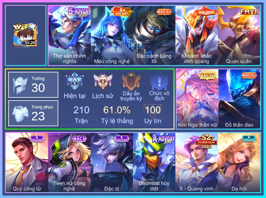 Arthur Đặc cảnh băng lôi, Krixi Phó văn nghệ, Telannas Dạ hội, Butterfly Thủy thủ, Butterfly Teen Nữ Công Nghệ, Butterfly Kim ngư thần nữ, Violet Huy Chương Vàng, Triệu Vân Quý Công Tử, Điêu Thuyền Mèo công nghệ, Capheny Hầu gái, Florentino S-Quang Vinh, Bonnie S Quang Vinh, Murad Đồ thần đao, Murad Đặc dị, Dirak Cảnh Vệ Bầu Trời, Mganga Doombot Hủy Diệt, Thorne Cận vệ hoàng gia, Thane Khoảnh khắc vinh quang, Krizzix Đội đặc nhiệm, Nakroth Quân đoàn địa ngục, Nakroth Quán quân, Kaine Thợ Săn Chính Nghĩa, Elsu Tuyết ưng