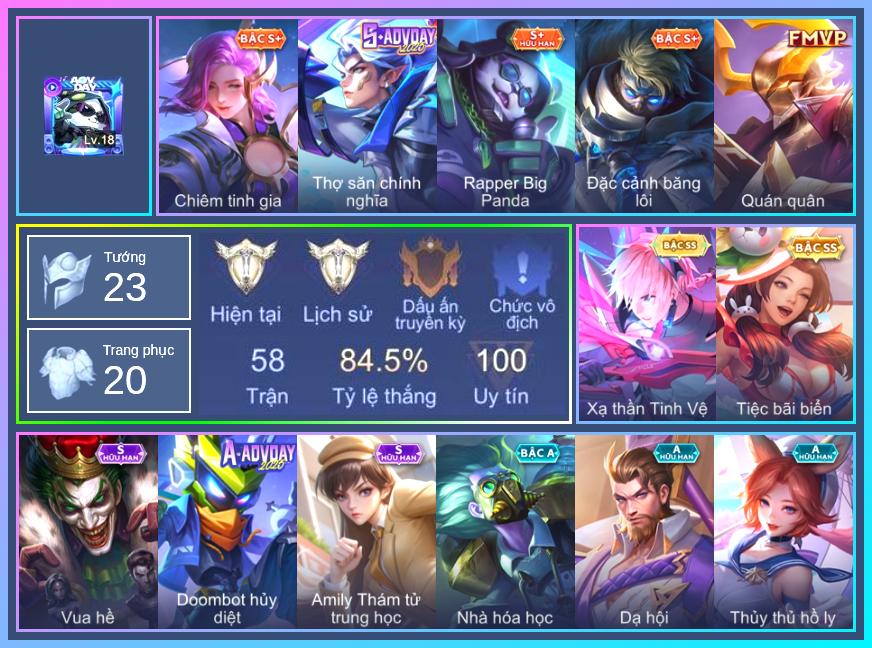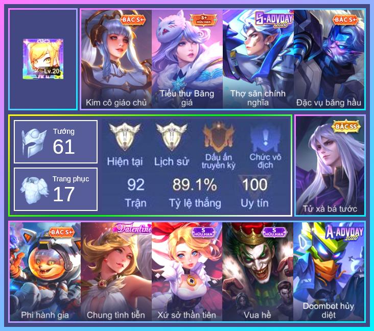 Krixi Phó văn nghệ, Sephera Chiêm tinh gia, Mganga Nhà hóa học, Mganga Doombot Hủy Diệt, Arthur Siêu sao Cricket, Arthur Đặc cảnh băng lôi, Zuka Rapper Big Panda, Stuart Vua hề, Nakroth Quán quân, Omen Sĩ Quan Viễn Chinh, Kaine Thợ Săn Chính Nghĩa, Ryoma Dạ hội, Murad Thợ Săn Tiền Thưởng, Thorne Cận vệ hoàng gia, Liliana Thuỷ thủ hồ ly, Xeniel Thiên Sứ Hủy Diệt, Bonnie S Quang Vinh, Laville Xạ Thần Tinh Vệ, Điêu Thuyền Tiệc bãi biển, Amily Thám tử trung học