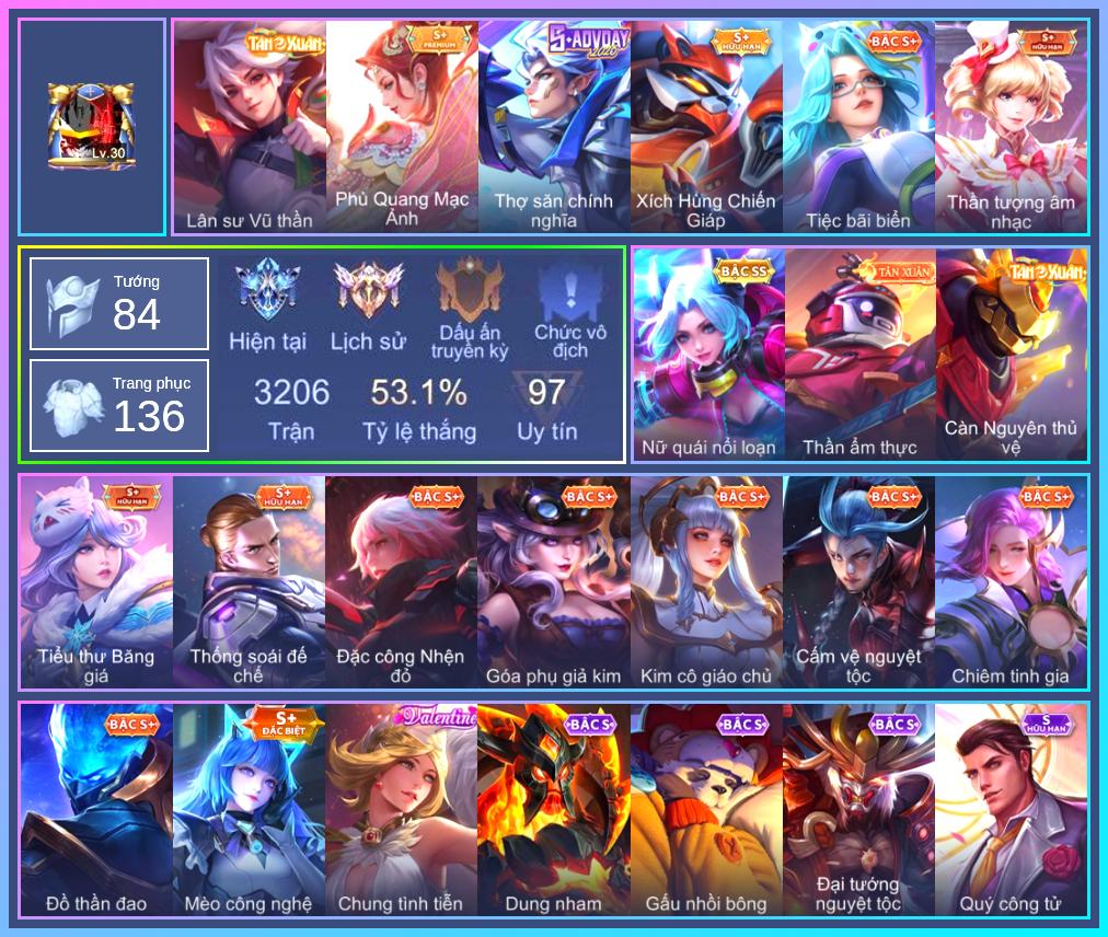 Valhein Hoàng tử Quạ, Valhein Số 7 Thần Sầu, Valhein S-Quang Vinh, Triệu Vân Quý Công Tử, Krixi Cô Tiên Thỏ, Krixi Thuỷ Thủ, Mina Đào tạo siêu sao, Mganga Doombot Hủy Diệt, Toro Bạch mao Ngưu, Kahlii Kim cô giáo chủ, Kahlii Siêu đầu bếp, Gildur phượt thủ, Gildur Đại gia học viện, Veera Goá Phụ, Lữ Bố Đặc Nhiệm Swat, Natalya Quý Cô Thủy Tề, Taara Hỏa Ngọc Nữ Đế, Max Quang Vinh, Max Chuyên gia đập hộp, Max Trà Chanh, Preyta Không Tặc, Preyta Phi cơ F1, Nakroth Producer Tia chớp, Lauriel Đọa Lạc Thiên Sứ, Kaine Đôi Cánh Đại Dương, Kaine Thợ Săn Chính Nghĩa, Violet Nữ đặc cảnh, Violet Huy Chương Vàng, TeeMee Xiếc Cung Đình, Teemee Tay đua siêu tốc, Zill Lốc Địa Ngục, Zill Dung nham, Ignis Quang Vinh, Richter Bá tước, Richter Dạ hội, Richter Quang vinh 2.0, Roxie Thám tử tập sự, Roxie Lễ hội hoa, TelAnnas Chung Tình Tiễn, Telannas Thánh nữ mật hội, Telannas Dạ hội, TelAnnas Quang Vinh, Tel Annas Jujutsu Sorcerer, Butterfly Teen Nữ Công Nghệ, Butterfly Nữ Quái Nổi Loạn, Butterfly Bình Minh Tận Thế, Lindis Quang Vinh, Lindis Đồng phục Shihakusho, Hayate Bạch ảnh, Hayate Bạch lang, Ryoma Thợ Săn Tiền Thưởng, Ryoma Đại Tướng Nguyệt Tộc, Ryoma Dạ hội, Volkath Tư lệnh viễn chinh, Zuka Phát Tài, Zuka Gấu Nhồi Bông, Zuka Đầu bếp hoàng cung, Zuka Xích Hùng Chiến Giáp, Sephera Quý tiểu thư, Sephera Chiêm tinh gia, Sephera Phi vụ thế kỷ, Sephera Thủy Liên Hoa, Quillen Trưởng ngoại khoa, Quillen Thống soái đế chế, Quillen Huyết phong, Keera Y tá lạ, Keera Thuỷ thủ, Fennik Nhà thám hiểm, Fennik Đội đặc nhiệm, Paine khúc nhạc tử vong, Dirak Quý tộc, Dirak Ông bầu Showbiz, Murad Đồ thần đao, Qi Tiểu long, Qi Thiếu nữ pháo hoa, Yorn Soái ca bãi biển, Airi Cấm Vệ Nguyệt Tộc, Airi Đặc công tử điệp, Airi Lễ hội mùa xuân, Florentino Vũ kiếm sư, Florentino Kiếm sĩ Olympic, Florentino Hisoka, Florentino S-Quang Vinh, Maloch Ác nhân vô tuyến, Maloch Đại ca Mukbang, Zephys Phi thương, Zephys Tư lệnh viễn chinh, Allain Lân sư Vũ thần, Grakk Thần ẩm thực, Ngộ Không Đạo tặc, Ngộ Không Cổ thần Ai Cập, Veres Chị đại học đường, Veres Tiệc bãi biển, Errol Stream đến bao giờ, Bright Soái ca thánh điện, Capheny Hầu gái, Capheny Thần tượng âm nhạc, Capheny S-Quang Vinh, Tulen Phù Thủy Kiến Tạo, KilGroth Cảnh Vệ Biển, KilGroth Càn Nguyên Thủ Vệ, Điêu Thuyền Mèo công nghệ, Thane Mật vụ, Ata Quang vinh, Ata Mèo đi mưa, Liliana Hồ Quý Phi, Liliana Thuỷ thủ hồ ly, Arthur Hoàng kim cốt, Arthur Siêu sao Cricket, Raz Đại tù trưởng, Sinestrea Tiểu thư băng giá, Sinestrea S-Quang vinh, Amily Đặc công nhện đỏ, Amily Hội ám hoàng, Celica S-Quang Vinh, Elsu Mafia, Ilumia Hồng Hoa Hậu, Ilumia Diva nổi loạn, Marja Phù Quang Mạc Ảnh, Arduin, Arduin Tà linh hiệp sỹ, Omega Cỗ Máy Siêu Tốc, Tachi Đao khách vô tình, Baldum, Alice The Butterfly Mansion Girl, Yan nhà chế tác, Jinna Hỏa nhãn ma vương, Rouie Sứ giả vũ trụ, Annette Xứ sở thần tiên, Slimz Sứ giả Thiên giới, Slimz Siêu Cấp Tối Thượng, Omen Thuyền trưởng hải tặc, Arum Thần tượng nhạc Rock, Laville Thám tử học đường, Xeniel Thiên Sứ Hủy Diệt, Bonnie S Quang Vinh