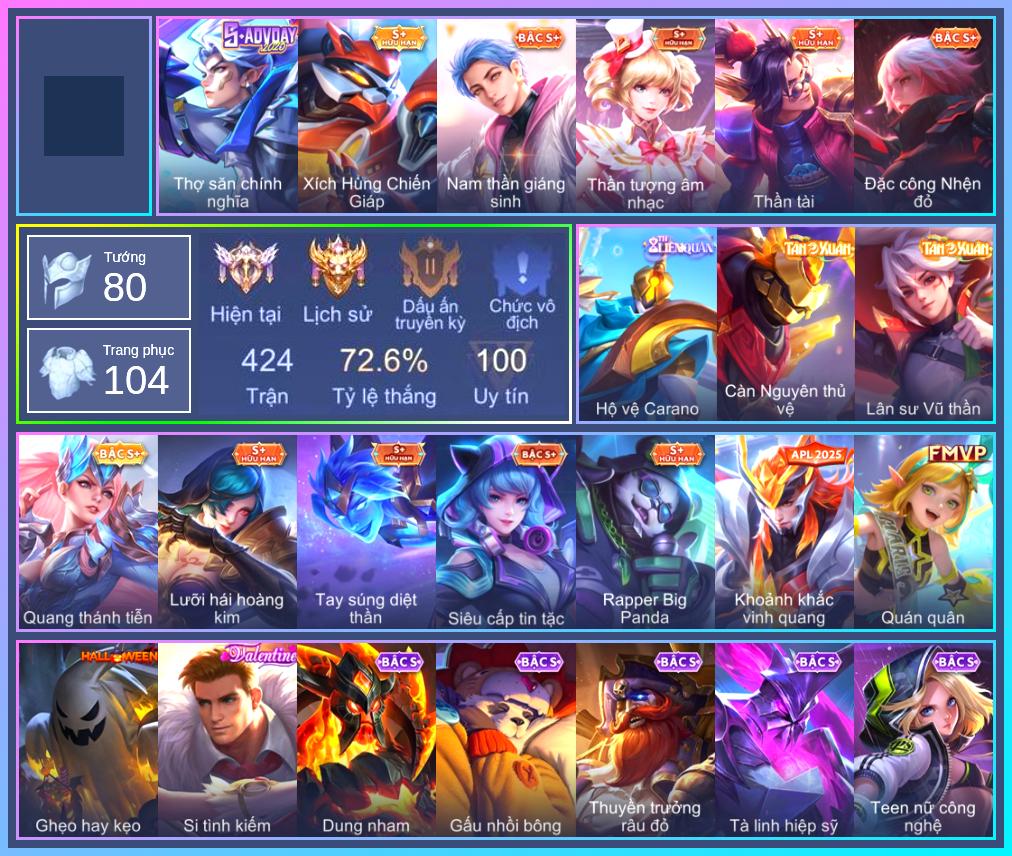 Valhein Hoàng tử Quạ, Valhein Số 7 Thần Sầu, Valhein Xạ Thần, Valhein S-Quang Vinh, Triệu Vân Thần Tài, Krixi Phó văn nghệ, Krixi Thuỷ Thủ, Krixi Quán quân, Gildur Đại gia học viện, Gildur Thuyền trưởng râu bạc, Arthur Si Tình Kiếm, Arthur Siêu sao Cricket, TelAnnas Cảnh Vệ Rừng, Telannas Thánh nữ mật hội, Telannas Dạ hội, Mganga Doombot Hủy Diệt, Grakk Thuyền Trưởng Râu Đỏ, Grakk Màu cờ sắc áo, Butterfly Teen Nữ Công Nghệ, Maloch Đại ca Mukbang, Laville Tay đua đường phố, Laville Tay súng diệt thần, Toro Trung Phong Cắm, Annette Xứ sở thần tiên, Yorn Nam thần Giáng sinh, Yorn Soái ca bãi biển, Zuka Phát Tài, Zuka Gấu Nhồi Bông, Zuka Đầu bếp hoàng cung, Zuka Rapper Big Panda, Zuka Xích Hùng Chiến Giáp, Murad Thiên Tài Sân Cỏ, Murad S-Quang Vinh, Zephys Tư lệnh viễn chinh, Fennik Nhà thám hiểm, Fennik Đội đặc nhiệm, Max Thần thoại Hy Lạp, Max Tiểu King Kong, Max Trà Chanh, Zill Dung nham, Zill Thần mộng mị, Veera Thiên nga đen, Lindis Quang thánh tiễn, Dirak Quý tộc, Dirak Đường chủ yêu giới, Thorne Cận vệ hoàng gia, Thorne Thám tử trung học, Florentino Vũ kiếm sư, Florentino Thần thoại Hy Lạp, Florentino S-Quang Vinh, Airi Phó kiếm đạo, Omen Sĩ Quan Viễn Chinh, Omen Thuyền trưởng hải tặc, Thane Khoảnh khắc vinh quang, Capheny Thần tượng âm nhạc, Capheny Siêu cấp tin tặc, Capheny S-Quang Vinh, Violet Phó học tập, Mina Tiểu thư đoạt hồn, Mina Lưỡi hái hoàng kim, Marja Linh Xà Tư Tế, Raz Đại tù trưởng, Hayate Bạch ảnh, Hayate Bạch lang, Astrid Bạch Kiếm Tiểu Thư, Bright Kỳ Lân Soái, Elsu Mafia, Elsu Tuyết ưng, Amily Đặc công nhện đỏ, Amily Khủng long xanh, Amily Thám tử trung học, Arduin Tà linh hiệp sỹ, Nakroth Quân đoàn địa ngục, Veres Chị đại học đường, Superman Chúa Tể Công Lý, Rouie Quang Vinh, Enzo Phẩm chất quý tộc, Enzo Leo núi, Alice Nhà chiêm tinh, Liliana Hồ Quý Phi, Liliana Thuỷ thủ hồ ly, Yena Nữ cướp biển, KilGroth Cảnh Vệ Biển, KilGroth Càn Nguyên Thủ Vệ, Rourke Cuồng tặc, Ngộ Không Đạo tặc, Ngộ Không Cổ thần Ai Cập, Bonnie S Quang Vinh, Slimz Thỏ nhồi bông, Slimz Sứ giả Thiên giới, Richter Quang vinh 2.0, Ignis Bắc băng vương, Allain Lân sư Vũ thần, Celica Tâm hồn trà sữa, Lauriel Đọa Lạc Thiên Sứ, Azzenka Ghẹo hay kẹo, Azzenka Quang Vinh 2.0, Điêu Thuyền Nữ Vương Anh Đào, Kaine Thợ Săn Chính Nghĩa, Omega Hộ Vệ Carano, Volkath Quang vinh, Sinestrea S-Quang vinh, Xeniel Thiên Sứ Hủy Diệt, Xeniel Kim sí điểu
