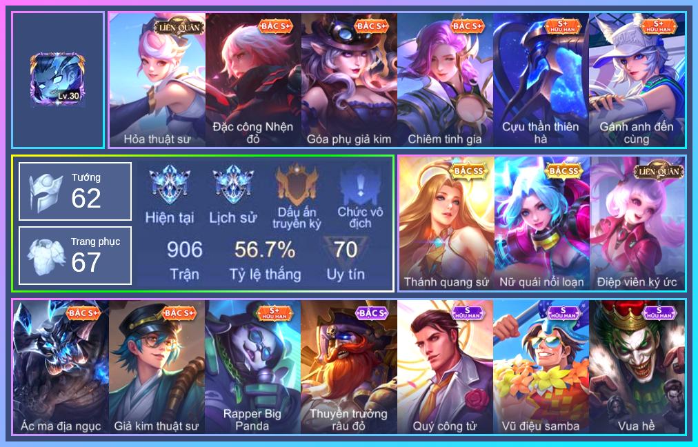 Valhein Hoàng tử Quạ, Valhein Xạ Thần, Triệu Vân Quý Công Tử, Krixi Thuỷ Thủ, Grakk Thuyền Trưởng Râu Đỏ, Grakk Màu cờ sắc áo, Butterfly Teen Nữ Công Nghệ, Butterfly Nữ Quái Nổi Loạn, Butterfly Gánh anh đến cùng, Maloch Ác Ma Địa Ngục, Maloch Đại ca Mukbang, Natalya Quý Cô Thủy Tề, Annette Xứ sở thần tiên, Preyta Không Tặc, Teemee Thịt xiên nướng, Toro Đặc cảnh NYPD, Lumburr, Arduin, Amily Đặc công nhện đỏ, Kaine Người dơi, TelAnnas Cảnh Vệ Rừng, Telannas Thánh nữ mật hội, Telannas Dạ hội, TelAnnas Quang Vinh, Zephys Tư lệnh viễn chinh, Zephys Inosuke Hashibira, Murad Thợ Săn Tiền Thưởng, Gildur Đại gia học viện, Veera Goá Phụ, Sephera Chiêm tinh gia, Stuart Vua hề, Raz Đại tù trưởng, Zill Lốc Địa Ngục, Zill Cựu thần thiên hà, Zill Thần mộng mị, Zata Tư lệnh viễn chinh, Errol Vượt ngục, Bright Kỳ Lân Soái, Omega Hộ vệ ba bích, Ryoma Dạ hội, Ngộ Không Cổ thần Ai Cập, Yena Nữ cướp biển, Fennik Shipper Siêu thanh, Ignis Hỏa Thuật Sư, Hayate Bạch lang, Qi Blogger Ẩm thực, Liliana Hồ Quý Phi, Thorne Giả kim thuật sư, Florentino Hisoka, Quillen Trưởng ngoại khoa, Quillen Sao đỏ học đường, Arthur Siêu sao Cricket, Lauriel Thánh quang sứ, Lauriel Nữ vương học đường 2, Zuka Rapper Big Panda, Richter Quang vinh 2.0, Celica Tâm hồn trà sữa, Sinestrea S-Quang vinh, Omen Sĩ Quan Viễn Chinh, Omen Thuyền trưởng hải tặc, Lữ Bố Vũ điệu Samba, Roxie Hỏa thuật sư, Aya Điệp viên ký ức, KilGroth Cảnh Vệ Biển, Capheny Hầu gái, Violet Phó học tập, Xeniel Kim sí điểu