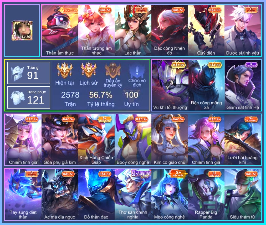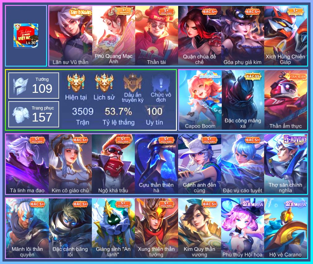 Valhein Hoàng tử Quạ, Valhein Thần tài, Valhein S-Quang Vinh, Triệu Vân Chiến tướng mùa đông, Krixi Xứ Sở Thần Tiên, Krixi Phó văn nghệ, Krixi Thuỷ Thủ, Taara Hỏa Ngọc Nữ Đế, TelAnnas Cảnh Vệ Rừng, Telannas Dạ hội, TelAnnas Quang Vinh, Tel Annas Jujutsu Sorcerer, Mganga Hề cung đình, Mganga Doombot Hủy Diệt, Grakk Màu cờ sắc áo, Grakk Thần ẩm thực, Butterfly Quận Chúa Đế Chế, Butterfly Gánh anh đến cùng, Butterfly Bình Minh Tận Thế, Maloch Tiệc hóa trang, Maloch Samurai Tử Sĩ, Maloch Đại ca Mukbang, Wisp Ếch nhồi bông, Annette Xứ sở thần tiên, Arthur Siêu sao Cricket, Arthur Đặc cảnh băng lôi, Violet Nữ đặc cảnh, Violet Tay Súng Siêu Phẩm, Violet Huy Chương Vàng, Yorn Soái ca bãi biển, Toro Bạch mao Ngưu, Toro Ngưu hải vương, Kahlii Kim cô giáo chủ, Kahlii Siêu đầu bếp, Kahlii Rối Nước Thuỷ Đình, Allain Lân sư Vũ thần, Veera Goá Phụ, Veera Phù thủy Hội họa, Stuart Vua hề, Ignis Vì sao con khóc, Ngộ Không Ngộ Khá Trẩu, Ngộ Không Cổ thần Ai Cập, Bright Kỳ Lân Soái, Krizzix Crursed Corpse, Qi Đặc vụ cáo tuyết, Qi Thiếu nữ pháo hoa, Qi Blogger Ẩm thực, Tulen Phù Thủy Kiến Tạo, Tulen Phó kỷ luật, Tulen Dạ hội, Rouie Sứ giả vũ trụ, Rouie Quang Vinh, Rouie Mèo hầu gái, Zill Cựu thần thiên hà, Zill Thần mộng mị, Lindis Đồng phục Shihakusho, Florentino Thần thoại Hy Lạp, Florentino Hisoka, Florentino S-Quang Vinh, Quillen Đặc công mãng xà, Quillen Tà linh ma đao, Quillen Huyết phong, Zephys Tư lệnh viễn chinh, Zephys Inosuke Hashibira, Nakroth Producer Tia chớp, Roxie Lễ hội hoa, Thane Mật vụ, Kaine Đôi Cánh Đại Dương, Kaine Thợ Săn Chính Nghĩa, Alice Xứ sở thần tiên, Alice Dạ hội, Alice The Butterfly Mansion Girl, Gildur Đại gia học viện, Gildur Thuyền trưởng râu bạc, Dextra Lữ khách cao nguyên, Raz Đại tù trưởng, Raz Mãnh lôi thần quyền, Mina Tiểu thư đoạt hồn, Mina Đào tạo siêu sao, Airi Đặc công tử điệp, Ybneth Hạt trưởng kiểm lâm, Ybneth Candy Bear, Omega Hộ vệ ba bích, Omega Hộ Vệ Carano, Azzenka Quang Vinh 2.0, AzzenKa Giáng sinh An lành, Arum Thú Vệ Cổ Mộ, Arum Thần tượng nhạc Rock, Laville Kim quy thần vương, Laville Thám tử học đường, Elsu Mafia, Fennik Đội đặc nhiệm, Fennik Tay đua F1, Fennik Shipper Siêu thanh, Aleister Thiếu Niên Hắc Ám, Xeniel Shipper bánh mỳ, Arduin, Murad S-Quang Vinh, Sephera Thủy Liên Hoa, Elandorr Phi vụ thế kỷ, Slimz Thỏ nhồi bông, Slimz Lẩu chua cay, Slimz Sứ giả Thiên giới, Slimz Siêu Cấp Tối Thượng, Enzo Phẩm chất quý tộc, Enzo Leo núi, Lữ Bố Vũ điệu Samba, Liliana Thuỷ thủ hồ ly, Amily Đặc cảnh NYPD, Amily Nữ đội trưởng, Amily Khủng long xanh, Amily Thám tử trung học, Teemee Giấc Mơ Ngọt Ngào, Yena Nữ hoàng thể thao, Yena Nữ cướp biển, Zuka Đại Phú Ông, Zuka Phát Tài, Zuka Đầu bếp hoàng cung, Zuka Xích Hùng Chiến Giáp, Lauriel Nữ vương học đường 2, Dirak Đường chủ yêu giới, Baldum Liệt hỏa dung nham, Baldum, Richter Quang vinh 2.0, Celica S-Quang Vinh, Veres Đạo tặc, Veres Thần thoại Hy Lạp, Veres Chị đại học đường, Sinestrea Lữ khách sa mạc, Sinestrea S-Quang vinh, Volkath Xung thiên thần tướng, Volkath Tư lệnh viễn chinh, Volkath Quang vinh, Capheny S-Quang Vinh, Thorne Cận vệ hoàng gia, Thorne Ước nguyện giáng sinh, Thorne Thám tử trung học, Keera Hồ điệp, Omen Thuyền trưởng hải tặc, Yan Giấc mơ sao, Ryoma Dạ hội, Ryoma Ailing Samurai, Hayate Ngân lang, Hayate Bạch lang, Tachi Đao khách vô tình, Skud Sơn Tặc, Marja Lam Hải yêu hậu, Marja Linh Xà Tư Tế, Marja Phù Quang Mạc Ảnh, Max Hiệp Sĩ Nhí, Max Tiểu King Kong, Max Trà Chanh, Dolia Môn đồ tập sự, Astrid Hoa anh đào, Bonnie S Quang Vinh, Caesar Bão tố, Ishar Capoo Boom