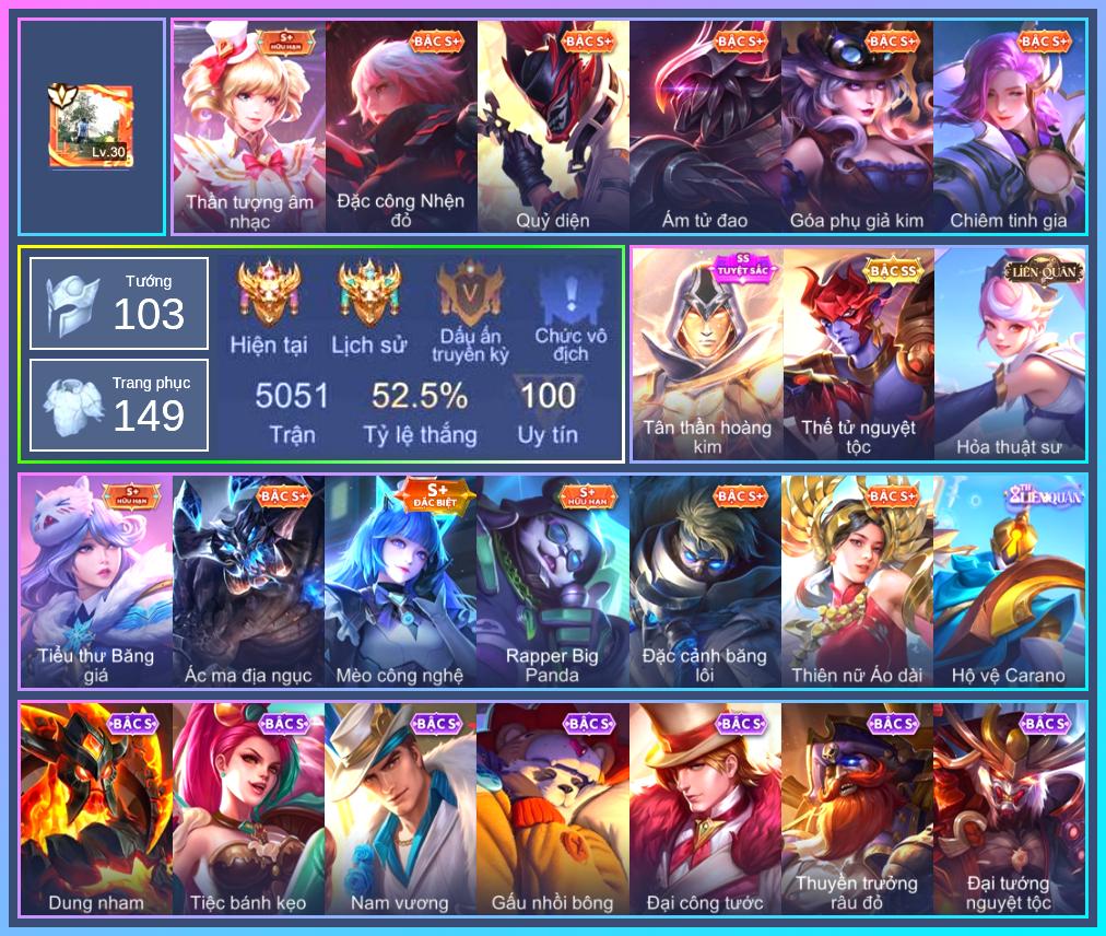 Valhein Hoàng tử Quạ, Valhein Đại Công Tước, Valhein Xạ Thần, Valhein S-Quang Vinh, Triệu Vân Quý Công Tử, Krixi Công chúa Bướm, Krixi Xứ Sở Thần Tiên, Krixi Cô Tiên Thỏ, Krixi Phó văn nghệ, Krixi Thần Thoại Hy Lạp, Krixi Thuỷ Thủ, Taara Đại tù trưởng, Taara Hỏa Ngọc Nữ Đế, Zuka Phát Tài, Zuka Gấu Nhồi Bông, Zuka Rapper Big Panda, Yorn Cung thủ bóng đêm, Yorn Thế Tử Nguyệt Tộc, Toro Đặc cảnh NYPD, Toro Trung Phong Cắm, Toro Bạch mao Ngưu, Gildur phượt thủ, Gildur Đại gia học viện, Skud Quang Vinh, Veera Goá Phụ, Veera Thiên nga đen, Mina Tiệc Bánh Kẹo, Butterfly Teen Nữ Công Nghệ, Airi Thích Khách, Airi Đặc công tử điệp, Airi Lễ hội mùa xuân, Mganga Hề cung đình, Mganga Quái tặc không gian, Mganga Doombot Hủy Diệt, Zill Lốc Địa Ngục, Zill Dung nham, Zill Thần mộng mị, Lindis Quang Vinh, Raz Đại tù trưởng, Grakk Thuyền Trưởng Râu Đỏ, Grakk Khô Lâu Đại Tướng, Natalya Quý Cô Thủy Tề, Ngộ Không Đạo tặc, Nakroth Chiến Binh Hỏa Ngục, Nakroth Producer Tia chớp, Helen Cảnh Vệ Rừng, Zephys Phi thương, Zephys Inosuke Hashibira, KilGroth Cảnh Vệ Biển, Cresht Thợ sửa cáp, Capheny Thần tượng âm nhạc, Capheny S-Quang Vinh, Kahlii Rối Nước Thuỷ Đình, Ignis Quang Vinh, TelAnnas Cảnh Vệ Rừng, TelAnnas Giám thị thân thiện, Telannas Thánh nữ mật hội, Telannas Dạ hội, TelAnnas Quang Vinh, Lauriel Đọa Lạc Thiên Sứ, Slimz Chú thỏ ngọc, Slimz Sứ giả Thiên giới, Marja Linh Xà Tư Tế, Kriknak Bọ Cánh Bạc, Murad Thợ Săn Tiền Thưởng, Murad S-Quang Vinh, Fennik Nhà thám hiểm, Fennik Đội đặc nhiệm, Fennik Tay đua F1, Ilumia Thiên nữ áo dài, Errol Vượt ngục, Errol Diệt nguyệt tiên phong, Lữ Bố Nam Vương, Lữ Bố Kỵ Sĩ Âm Phủ, Điêu Thuyền Nữ Vương Anh Đào, Điêu Thuyền Mèo công nghệ, Annette Nữ quản ga, Annette Băng kỳ lâm, Wisp Hải Tặc Nhí, Stuart Trò đùa tử vong, Stuart Gã hề, Moren Anh thợ điện, Aleister Thiếu Niên Hắc Ám, Aleister Quỷ soái nguyệt tộc, Violet Nữ đặc cảnh, Violet Phó học tập, Violet Huy Chương Vàng, Arduin, Arduin Quang Vinh, Alice Xứ sở thần tiên, Alice The Butterfly Mansion Girl, Omen Sĩ Quan Viễn Chinh, Omen Ám tử đao, Amily Đặc cảnh NYPD, Amily Đặc công nhện đỏ, Amily Thư ký, Amily Hội ám hoàng, Amily Khủng long xanh, Rourke Pháo Thủ Tuộc Neo, Liliana Hồ Quý Phi, Richter Bá tước, Richter Dạ hội, Richter Quang vinh 2.0, Tulen Tân thần hoàng kim, Tulen Dạ hội, Veres Đạo tặc, Arthur Hoàng kim cốt, Arthur Siêu sao Cricket, Arthur Đặc cảnh băng lôi, Thane Kẻ Hủy Diệt, Ishar Giấc Mơ Ngọt Ngào, Ryoma Thợ Săn Tiền Thưởng, Ryoma Đại Tướng Nguyệt Tộc, Ryoma Dạ hội, Hayate Bạch ảnh, Hayate Quỷ diện, Hayate Bạch lang, Kaine Người dơi, Azzenka Quang Vinh 2.0, Lumburr, Florentino S-Quang Vinh, Elandorr Soái tặc, Dirak Quý tộc, Dirak Đường chủ yêu giới, Keera Thuỷ thủ, Celica S-Quang Vinh, Qi Thiếu nữ pháo hoa, Qi Blogger Ẩm thực, Maloch Ác Ma Địa Ngục, Maloch Ác nhân vô tuyến, Omega Người máy xanh, Omega Hộ vệ ba bích, Omega Hộ Vệ Carano, Iggy Bạch hồ ly, Ata Quang vinh, Dextra Quý cô Tuổi Dần, Sinestrea Tiểu thư băng giá, Sinestrea S-Quang vinh, Xeniel Kim sí điểu, Sephera Chiêm tinh gia, Sephera Thủy Liên Hoa, Roxie Lễ hội hoa, Roxie Hỏa thuật sư, Tachi Đao khách vô tình, Lorion Chiến giáp hắc ám, Laville Tay đua đường phố, Rouie Quang Vinh, Volkath Tư lệnh viễn chinh, Bonnie S Quang Vinh