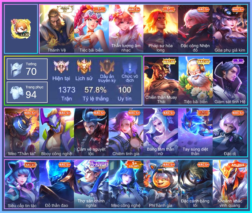 Valhein Hoàng tử Quạ, Valhein Khiêu chiến, Krixi Thuỷ Thủ, Veera Goá Phụ, Mganga Doombot Hủy Diệt, Taara Hỏa Ngọc Nữ Đế, Gildur Tiệc Bãi Biển, Gildur Đại gia học viện, Natalya Băng tâm thần nữ, Fennik Tiệc Bánh Kẹo, Fennik Phi hành gia, Ngộ Không Nhóc tỳ bá đạo, Butterfly Teen Nữ Công Nghệ, Zuka Gấu Nhồi Bông, Arthur Lãnh chúa xương, Arthur Si Tình Kiếm, Arthur Siêu sao Cricket, Arthur Đặc cảnh băng lôi, Veres Đạo tặc, Violet Nữ đặc cảnh, Violet Phó học tập, Violet Đặc Dị, Violet Huy Chương Vàng, Enzo Phẩm chất quý tộc, Zill Dung nham, Zill Thần mộng mị, Ryoma Thợ Săn Tiền Thưởng, Ryoma Đại Tướng Nguyệt Tộc, Ryoma Dạ hội, Hayate Bạch ảnh, Elandorr Học viện Carano, Rouie Quang Vinh, Capheny Siêu cấp tin tặc, Teemee Tay đua siêu tốc, Yena Hoạt náo viên, Yena Nữ hoàng thể thao, Alice Dạ hội, Sephera Chiêm tinh gia, Nakroth BBoy công nghệ, Nakroth Siêu Việt 1, Wisp Hải Tặc Nhí, Wisp Ếch nhồi bông, Preyta Phi cơ F1, Darcy Pháp sư hỏa long, Murad Đồ thần đao, Florentino Giám sát tinh hệ, Ishar Giấc Mơ Ngọt Ngào, Dextra Quý cô Tuổi Dần, Aleister Quỷ soái nguyệt tộc, Dirak Quý tộc, Dirak Ông bầu Showbiz, Liliana Hồ Quý Phi, Liliana thần tượng âm nhạc, Liliana Thuỷ thủ hồ ly, Chaugnar Quân cảnh, Errol Vượt ngục, Raz Đại tù trưởng, Raz Chiến thần Muay Thái, Amily Đặc công nhện đỏ, Amily Hội ám hoàng, Amily Thám tử trung học, Grakk Mèo thần tài, Laville Tay súng diệt thần, Arduin Tà linh hiệp sỹ, Qi Tiểu long, Qi Thiếu nữ pháo hoa, Qi Blogger Ẩm thực, Ybneth Candy Bear, Điêu Thuyền Mèo công nghệ, Kaine Thợ Săn Chính Nghĩa, Sinestrea S-Quang vinh, Roxie Lễ hội hoa, Telannas Thánh nữ mật hội, Telannas Dạ hội, Tel Annas Jujutsu Sorcerer, Airi Cấm Vệ Nguyệt Tộc, Airi Tiệc bãi biển, Annette Xứ sở thần tiên, Bonnie S Quang Vinh, Tachi Đao khách vô tình, Omen Sĩ Quan Viễn Chinh, Thorne Cận vệ hoàng gia, Thorne Thám tử trung học, Arum Thú Vệ Cổ Mộ, Arum Linh tượng vu nữ, Xeniel Kim sí điểu, Marja Linh Xà Tư Tế, KilGroth Cảnh Vệ Biển, Kriknak Bọ Cánh Bạc, Thane Khoảnh khắc vinh quang, Lữ Bố Hoả Long Chiến Thần, Rourke Thánh Vệ, Ming thầy tướng, Jinna Dạ xoa vương