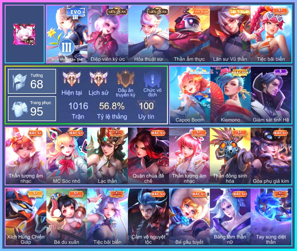Arthur Đặc cảnh băng lôi, Krixi Phó văn nghệ, TelAnnas Giám thị thân thiện, Telannas Dạ hội, Tel Annas Jujutsu Sorcerer, Ilumia Thiên nữ áo dài, Butterfly Quận Chúa Đế Chế, Butterfly Bình Minh Tận Thế, Natalya Băng tâm thần nữ, Violet Huy Chương Vàng, Allain Lân sư Vũ thần, Veera Goá Phụ, Veera Thiên nga đen, Veera Phù thủy Hội họa, Stuart Vua hề, Alice Nhà chiêm tinh, Alice Bé Gấu Tuyết, Alice Xứ sở thần tiên, Alice Dạ hội, Alice bé du xuân, Yorn Đặc Nhiệm Swat, Điêu thuyền Vũ điệu nghê thường, Roxie Hầu gái, Roxie Cháy Phố, Roxie Hỏa thuật sư, Grakk Thần ẩm thực, Airi Cấm Vệ Nguyệt Tộc, Airi Kiemono, Airi Tiệc bãi biển, Airi Đặc công tử điệp, Gildur Thuyền trưởng râu bạc, Aya Điệp viên ký ức, Aya MC Sóc nhỏ, Ming thầy tướng, Max Thần đồng sinh hóa, Max Trà Chanh, Lữ Bố Hoả Long Chiến Thần, Arduin, Annette Xứ sở thần tiên, Annette Thần tượng âm nhạc, Keera Học viên Carano, Keera Thuỷ thủ, Keera Nghệ sĩ Graffiti, Keera Hồ điệp, Ngộ Không Cổ thần Ai Cập, Nakroth Producer Tia chớp, Rouie Sứ giả vũ trụ, Rouie Mèo hầu gái, Tachi Đao khách vô tình, Yena Nữ hoàng thể thao, Slimz Siêu Cấp Tối Thượng, Liliana Hồ Quý Phi, Liliana thần tượng âm nhạc, Liliana Tiệc bãi biển, Tulen Phù Thủy Kiến Tạo, Tulen Phó kỷ luật, Omega Hộ Vệ Carano, Qi Tiểu long, Sinestrea S-Quang vinh, Teemee Thịt xiên nướng, Teemee Giấc Mơ Ngọt Ngào, Kahlii Tử điệp, Kahlii Rối Nước Thuỷ Đình, Thorne Ước nguyện giáng sinh, Thorne Thám tử trung học, Dextra Quý cô Tuổi Dần, Mganga Doombot Hủy Diệt, Dolia Môn đồ tập sự, Lauriel Lạc thần, Mina Đào tạo siêu sao, Volkath Quang vinh, Zuka Đại Phú Ông, Zuka Phát Tài, Zuka Xích Hùng Chiến Giáp, Astrid Hoa anh đào, Errol Diệt nguyệt tiên phong, Krizzix Crursed Corpse, Laville Tay súng diệt thần, Ryoma Đại Tướng Nguyệt Tộc, Hayate Bạch lang, Florentino Giám sát tinh hệ, Florentino S-Quang Vinh, Veres Thần thoại Hy Lạp, Taara Tư lệnh hải âu, Zill Quái xế, Kaine Thợ Săn Chính Nghĩa, Iggy Bạch hồ ly, Capheny Siêu cấp tin tặc, Bonnie S Quang Vinh, Amily Thám tử trung học, Ignis Vì sao con khóc, Elandorr Soái tặc, Ishar Capoo Boom, Sephera Thủy Liên Hoa, Ybneth Candy Bear