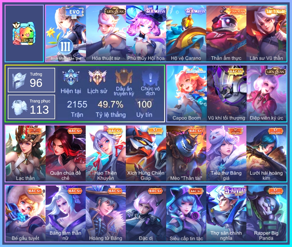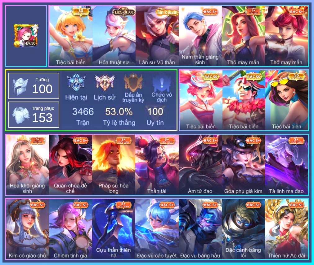 Arthur Siêu sao Cricket, Arthur Đặc cảnh băng lôi, Krixi Xứ Sở Thần Tiên, Krixi Phó văn nghệ, Krixi Thuỷ Thủ, TelAnnas Giám thị thân thiện, Telannas Thánh nữ mật hội, Telannas Dạ hội, Tel Annas Jujutsu Sorcerer, Valhein Hoàng tử Quạ, Valhein Vũ khí tối thượng, Butterfly Teen Nữ Công Nghệ, Butterfly Quận Chúa Đế Chế, Violet Phi Công Trẻ, Violet Phó học tập, Violet Huy Chương Vàng, Triệu Vân Quý Công Tử, Alice Xứ sở thần tiên, Maloch Đại ca Mukbang, Yorn Đặc Nhiệm Swat, Yorn Soái ca bãi biển, Florentino Vũ kiếm sư, Florentino Kiếm sĩ Olympic, Florentino Thần thoại Hy Lạp, Florentino Hisoka, Stuart Vua hề, Stuart Gã hề, Lữ Bố Vũ điệu Samba, Fennik Shipper Siêu thanh, Grakk Thần ẩm thực, Qi Blogger Ẩm thực, Ngộ Không Cổ thần Ai Cập, Laville Tay đua đường phố, Max Chuyên gia đập hộp, Nakroth Producer Tia chớp, Zill Thần mộng mị, Tulen Dạ hội, Yan Nghệ nhân trung thu, Ilumia Ngược dòng thời gian, Murad Thợ Săn Tiền Thưởng, Zuka Gấu Nhồi Bông, Zuka Rapper Big Panda, Amily Đặc công nhện đỏ, Amily Thám tử trung học, Veres Đạo tặc, Yena Nữ hoàng thể thao, Celica Tâm hồn trà sữa, Bright Kỳ Lân Soái, Roxie Hỏa thuật sư, Aya Điệp viên ký ức, Airi Tiệc bãi biển, Capheny Hầu gái, Capheny S-Quang Vinh, Keera Hồ điệp, Enzo Phẩm chất quý tộc, Enzo Leo núi, Marja Linh Xà Tư Tế, Raz Đại tù trưởng, KilGroth Cảnh Vệ Biển, Mganga Doombot Hủy Diệt, Liliana Thuỷ thủ hồ ly, Bonnie S Quang Vinh, Dextra Chiến binh quyến rũ, Thorne Thám tử trung học, Ignis Vì sao con khóc, Ishar Capoo Boom, Ybneth Candy Bear, Sinestrea Lữ khách sa mạc