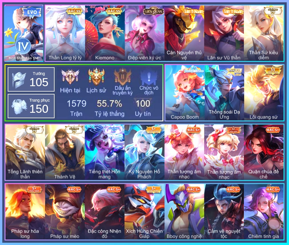 Valhein Hoàng tử Quạ, Valhein Số 7 Thần Sầu, Valhein S-Quang Vinh, TelAnnas Giám thị thân thiện, TelAnnas Chung Tình Tiễn, Telannas Dạ hội, TelAnnas Quang Vinh, Tel Annas Jujutsu Sorcerer, TelAnnas Kỷ Nguyên Hồ Phách, Arthur Siêu sao Cricket, Arthur Đặc cảnh băng lôi, Krixi Xứ Sở Thần Tiên, Krixi Phó văn nghệ, Krixi Thần Thoại Hy Lạp, Krixi Thuỷ Thủ, Violet Phi Công Trẻ, Violet Huy Chương Vàng, Violet Thần long tỷ tỷ, Butterfly Quận Chúa Đế Chế, Butterfly Gánh anh đến cùng, Butterfly Bình Minh Tận Thế, Laville Kim quy thần vương, Allain Lân sư Vũ thần, Triệu Vân Chiến tướng mùa đông, Alice Xứ sở thần tiên, Alice The Butterfly Mansion Girl, Yorn Đặc Nhiệm Swat, Yorn Soái ca bãi biển, Maloch Ác Ma Địa Ngục, Maloch Ác nhân vô tuyến, Stuart Vua hề, Stuart Gã hề, Hayate Bạch lang, Hayate Thống Soái Dạ Ưng, Slimz Thỏ nhồi bông, Toro Ngưu hải vương, Veera Thiên nga đen, Veera Phù thủy Hội họa, Gildur Đại gia học viện, Airi Cấm Vệ Nguyệt Tộc, Airi Kiemono, Dextra Quý cô Tuổi Dần, Ngộ Không Đạo tặc, Ngộ Không Cổ thần Ai Cập, Zuka Đại Phú Ông, Zuka Đầu bếp hoàng cung, Zuka Rapper Big Panda, Zuka Xích Hùng Chiến Giáp, Thorne Giả kim thuật sư, Thorne Ước nguyện giáng sinh, Thorne Thám tử trung học, Florentino Hisoka, Florentino S-Quang Vinh, Qi Thiếu nữ pháo hoa, Qi Blogger Ẩm thực, Nakroth BBoy công nghệ, Nakroth Lôi Quang Sứ, Nakroth Siêu Việt 1, Amily Đặc công nhện đỏ, Amily Thám tử trung học, Arduin Tà linh hiệp sỹ, Sephera Chiêm tinh gia, Ybneth Hạt trưởng kiểm lâm, Ybneth Candy Bear, Raz Saitama Cosplay, Roxie Lễ hội hoa, Zata Thần mặt trời, Yena Nữ hoàng thể thao, Yena Thần Sứ kiều diễm, Elandorr Soái tặc, Zill Thần mộng mị, Zephys Tư lệnh viễn chinh, Zephys Đầu bếp Sashimi, Annette Xứ sở thần tiên, Errol Diệt nguyệt tiên phong, Lauriel Đọa Lạc Thiên Sứ, Lauriel Nữ vương học đường 2, Murad S-Quang Vinh, Capheny Thần tượng âm nhạc, Elsu Mafia, Thane Mật vụ, Thane Khoảnh khắc vinh quang, Kahlii Tử điệp, Kahlii Rối Nước Thuỷ Đình, Ormarr Giáo Viên Thể Hình, Tulen Phó kỷ luật, Kaine Thợ Săn Chính Nghĩa, Richter Quang vinh 2.0, Richter Tổng Lãnh Thiên Thần, Keera Học viên Carano, Aya Điệp viên ký ức, Omen Thuyền trưởng hải tặc, Baldum chú thợ ống nước, Astrid Hoa anh đào, Mganga Hề cung đình, Mganga Pháp sư mèo, Mganga Doombot Hủy Diệt, Tachi S-Vinh Quang, Tachi Đao khách vô tình, Fennik Nhà thám hiểm, Fennik Đội đặc nhiệm, Fennik Tay đua F1, Bright Kỳ Lân Soái, Yue Tiểu công Chúa, Mina Lưỡi hái hoàng kim, Mina Đào tạo siêu sao, Taara Hỏa Ngọc Nữ Đế, Celica Tâm hồn trà sữa, Lumburr, Lumburr Golem thảo nguyên, Teemee Thịt xiên nướng, Teemee Giấc Mơ Ngọt Ngào, Liliana thần tượng âm nhạc, Ignis Bắc băng vương, Ignis Nguyệt lão, Ignis Vì sao con khóc, Xeniel Thiên Sứ Hủy Diệt, Azzenka Quang Vinh 2.0, AzzenKa Giáng sinh An lành, Paine khúc nhạc tử vong, Sinestrea Lữ khách sa mạc, Sinestrea S-Quang vinh, Aleister Xứ sở thần tiên, Điêu Thuyền Mèo công nghệ, Rouie Mèo hầu gái, Dirak Cảnh Vệ Bầu Trời, Dirak Đường chủ yêu giới, Omega Hộ Vệ Carano, Iggy Bạch hồ ly, Iggy Tiếng thét Hỗn mang, Darcy Pháp sư hỏa long, Lữ Bố Nam Vương, Ilumia Nữ Chúa Tuyết, Ilumia Thiên nữ áo dài, Dolia Môn đồ tập sự, Volkath Xung thiên thần tướng, Volkath Quang vinh, Veres Thần thoại Hy Lạp, Caesar Bão tố, Max Trà Chanh, KilGroth Càn Nguyên Thủ Vệ, Ata Tân thủy thủ, Krizzix Crursed Corpse, Zip Gà siêu quậy, Rourke Thánh Vệ, Bonnie S Quang Vinh, Marja Linh Xà Tư Tế, Moren Lính cứu hỏa, Ishar Quận chúa sông Nile, Ishar Capoo Boom