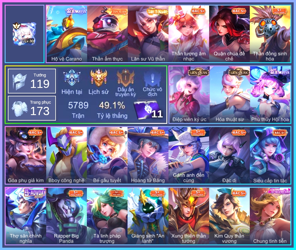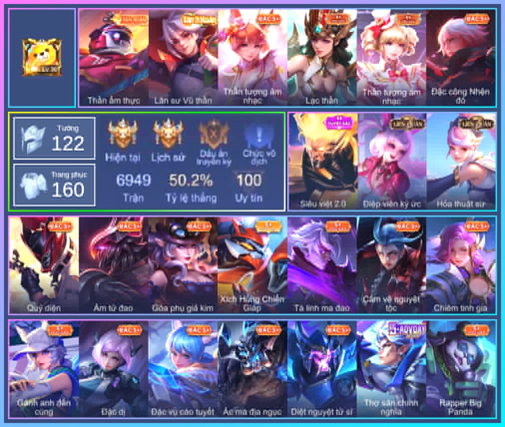 Valhein Hoàng tử Quạ, Valhein Số 7 Thần Sầu, Valhein Xạ Thần, Valhein S-Quang Vinh, TelAnnas Giám thị thân thiện, Telannas Dạ hội, TelAnnas Quang Vinh, Arthur Hoàng kim cốt, Arthur Siêu sao Cricket, Arthur Đặc cảnh băng lôi, Butterfly Teen Nữ Công Nghệ, Butterfly Quận Chúa Đế Chế, Butterfly Gánh anh đến cùng, Butterfly Bình Minh Tận Thế, Violet Nữ đặc cảnh, Violet Phi Công Trẻ, Violet Đặc Dị, Krixi Cô Tiên Thỏ, Krixi Phó văn nghệ, Krixi Thuỷ Thủ, Gildur Tiệc Bãi Biển, Gildur phượt thủ, Gildur Đại gia học viện, Gildur Đại võ sư, Zephys Inosuke Hashibira, Zuka Gấu Nhồi Bông, Zuka Đầu bếp hoàng cung, Ignis Bắc băng vương, Ignis Vì sao con khóc, Triệu Vân Quý Công Tử, Triệu Vân Thần Tài, Maloch Ác Ma Địa Ngục, Maloch Samurai Tử Sĩ, Maloch Đại Tướng Robot, Veera Thiên nga đen, Alice Xứ sở thần tiên, Alice The Butterfly Mansion Girl, Stuart Vua hề, Stuart Gã hề, Bright Soái ca thánh điện, Bright Kỳ Lân Soái, Yorn Đặc Nhiệm Swat, Yorn Soái ca bãi biển, Grakk Thuyền Trưởng Râu Đỏ, Grakk Mèo thần tài, Grakk Màu cờ sắc áo, Grakk Thần ẩm thực, KilGroth Cảnh Vệ Biển, Qi Quán quân, Qi Thiếu nữ pháo hoa, Qi Blogger Ẩm thực, Ngộ Không Đạo tặc, Ngộ Không Cổ thần Ai Cập, Airi Ninja Xanh Lá, Airi Mỵ Hồ, Airi Đặc công tử điệp, Omen Sĩ Quan Viễn Chinh, Omen Thuyền trưởng hải tặc, Raz Đại tù trưởng, Lindis Thám Tử Tư, Lindis Đồng phục Shihakusho, Florentino Vũ kiếm sư, Florentino Thần thoại Hy Lạp, Florentino S-Quang Vinh, Elsu Mafia, Murad Thợ Săn Tiền Thưởng, Murad S-Quang Vinh, Toro Trung Phong Cắm, Zip Cá siêu quậy, Zip Ông trùm giáng sinh, Tulen Dạ hội, Tulen Tân niên vệ thần, Marja Linh Xà Tư Tế, Kahlii Quàng Khăn Đỏ, Sephera Chiêm tinh gia, Sephera Thủy Liên Hoa, Amily Đặc cảnh NYPD, Amily Đặc công nhện đỏ, Amily Nữ đội trưởng, Amily Thám tử trung học, Roxie Lễ hội hoa, Roxie Hỏa thuật sư, Zill Diệt nguyệt tử sĩ, Zill Thần mộng mị, Errol Vượt ngục, Errol Stream đến bao giờ, Omega Hộ vệ ba bích, Tachi S-Vinh Quang, Ryoma Dạ hội, Rourke Pháo Thủ Tuộc Neo, Nakroth Siêu Việt 1, Kaine Đôi Cánh Đại Dương, Kaine Thợ Săn Chính Nghĩa, Lauriel Đọa Lạc Thiên Sứ, Lauriel Hỏa Phượng Hoàng, Lauriel Nữ vương học đường 2, Hayate Bạch ảnh, Hayate Bạch lang, Lữ Bố Nam Vương, Lữ Bố Kỵ Sĩ Âm Phủ, Lữ Bố Hoả Long Chiến Thần, Fennik Nhà thám hiểm, Fennik Shipper Siêu thanh, Natalya Quý Cô Thủy Tề, Mganga Doombot Hủy Diệt, Veres Chị đại học đường, Rouie Quang Vinh, Liliana Hồ Quý Phi, Liliana thần tượng âm nhạc, Liliana Thuỷ thủ hồ ly, Laville Tay đua đường phố, Paine khúc nhạc tử vong, Yue Tiểu công Chúa, Enzo Phẩm chất quý tộc, Enzo Thần thoại Hy Lạp, Enzo Leo núi, Wonder Woman Thế Chiến, Yena Hoạt náo viên, Yena Nữ hoàng thể thao, Yena Nữ cướp biển, Elandorr Phi vụ thế kỷ, Elandorr Học viện Carano, Capheny Hầu gái, Capheny S-Quang Vinh, Volkath Tư lệnh viễn chinh, Volkath Quang vinh, Slimz Thỏ Thợ Mỏ, Slimz Lẩu chua cay, Slimz Sứ giả Thiên giới, Lorion Chiến giáp hắc ám, Ata Mèo đi mưa, Xeniel Thiên Sứ Hủy Diệt, Xeniel Kim sí điểu, Xeniel Shipper bánh mỳ, Sinestrea Giấc mơ trưa, Sinestrea Tiểu thư băng giá, Sinestrea Đại tiểu thư 1, Aya Điệp viên ký ức, Richter Dạ hội, Richter Quang vinh 2.0, Azzenka Quang Vinh 2.0, Max Hiệp Sĩ Nhí, Aleister Xứ sở thần tiên, Darcy Pháp sư hỏa long, Keera Hồ điệp, Thorne Cận vệ hoàng gia, Thorne Thám tử trung học, Kriknak Bọ Cánh Bạc, Annette Xứ sở thần tiên, Ishar Capoo Boom, Dirak Cảnh Vệ Bầu Trời, Bonnie S Quang Vinh, Wisp Hải Tặc Nhí, Caesar Bão tố, Ybneth Candy Bear