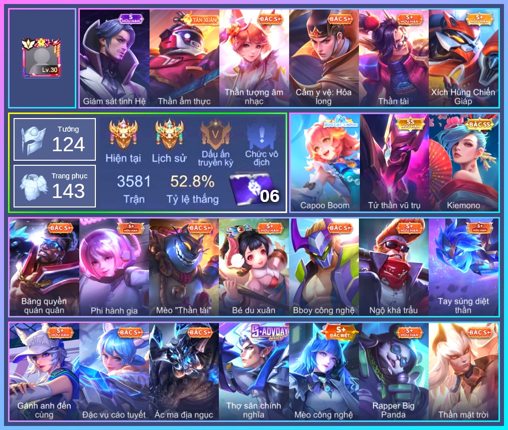 Valhein Hoàng tử Quạ, Valhein Xạ Thần, Valhein S-Quang Vinh, Triệu Vân Quý Công Tử, Triệu Vân Cẩm y vệ_ Hỏa Long, Triệu Vân Thần Tài, Krixi Phó văn nghệ, Krixi Thuỷ Thủ, Mganga Doombot Hủy Diệt, Grakk Thuyền Trưởng Râu Đỏ, Grakk Mèo thần tài, Grakk Màu cờ sắc áo, Grakk Thần ẩm thực, Butterfly Teen Nữ Công Nghệ, Butterfly Gánh anh đến cùng, Butterfly Bình Minh Tận Thế, Maloch Ác Ma Địa Ngục, Maloch Ác nhân vô tuyến, Toro Bạch mao Ngưu, Annette Nữ quản ga, Preyta Không Tặc, Kahlii Siêu đầu bếp, Kahlii Rối Nước Thuỷ Đình, Gildur phượt thủ, Mina Chị đại lắm chiêu, Fennik Tiệc Bánh Kẹo, Fennik Tay đua F1, Keera Nghệ sĩ Graffiti, Max Trà Chanh, Amily Hội ám hoàng, Amily Khủng long xanh, Kaine Đôi Cánh Đại Dương, Kaine Người dơi, Kaine Thợ Săn Chính Nghĩa, Volkath Tư lệnh viễn chinh, Volkath Quang vinh, Lindis Đồng phục Shihakusho, Airi Thích Khách, Airi Kiemono, Airi Đặc công tử điệp, Airi Lễ hội mùa xuân, TelAnnas Cảnh Vệ Rừng, Telannas Dạ hội, TelAnnas Quang Vinh, Natalya Nghệ nhân lân, Natalya Quý Cô Thủy Tề, Natalya Phó nháy nhí nhảnh, Ata Quang vinh, Ata Mèo đi mưa, Murad Thợ Săn Tiền Thưởng, Murad M-TP Thần Tượng Học Đường, Murad S-Quang Vinh, Dirak Quý tộc, Dirak Ông bầu Showbiz, Florentino Vũ kiếm sư, Florentino Giám sát tinh hệ, Florentino Kiếm sĩ Olympic, Florentino Thần thoại Hy Lạp, Florentino S-Quang Vinh, Ngộ Không Đạo tặc, Ngộ Không Ngộ Khá Trẩu, Ngộ Không Nhóc tỳ bá đạo, Ngộ Không Cổ thần Ai Cập, Zip Cá siêu quậy, Lauriel Nữ vương học đường 2, Zata Tư lệnh viễn chinh, Zata Thần mặt trời, Enzo Phẩm chất quý tộc, Enzo Thần thoại Hy Lạp, Enzo Leo núi, Bright Soái ca thánh điện, Capheny Hầu gái, Capheny Phi hành gia, Capheny S-Quang Vinh, Qi Đặc vụ cáo tuyết, Qi Thiếu nữ pháo hoa, Qi Blogger Ẩm thực, Điêu Thuyền Mèo công nghệ, Errol Diệt nguyệt tiên phong, Ignis Vì sao con khóc, Zephys Phi thương, Zephys Inosuke Hashibira, Taara Hỏa Ngọc Nữ Đế, Zill Dung nham, Raz Đại tù trưởng, Raz Băng Quyền Quán Quân, Ybneth Candy Bear, Zuka Đại Phú Ông, Zuka Giáo Sư Sừng Sỏ, Zuka Phát Tài, Zuka Gấu Nhồi Bông, Zuka Đầu bếp hoàng cung, Zuka Rapper Big Panda, Zuka Xích Hùng Chiến Giáp, Arum Nữ hoàng gấu xám, Arum Thần tượng nhạc Rock, Nakroth BBoy công nghệ, Nakroth Producer Tia chớp, Elandorr Phi vụ thế kỷ, Elandorr Học viện Carano, Alice bé du xuân, Arthur Siêu sao Cricket, Ryoma Đại Tướng Nguyệt Tộc, Ryoma Dạ hội, Tulen Phù Thủy Kiến Tạo, Tulen Dạ hội, Celica S-Quang Vinh, Dextra Quý cô Tuổi Dần, Hayate Bạch ảnh, Hayate Ngân lang, Hayate Tử thần vũ trụ, Hayate Bạch lang, Aleister Thiếu Niên Hắc Ám, Aleister Quỷ soái nguyệt tộc, Aleister Xứ sở thần tiên, Yan nhà chế tác, Roxie Hầu gái, Roxie Lễ hội hoa, Yena Nữ hoàng thể thao, Richter Bá tước, Richter Dạ hội, Richter Quang vinh 2.0, Liliana thần tượng âm nhạc, Paine khúc nhạc tử vong, Wonder Woman Thế Chiến, Krizzix Crursed Corpse, Violet Nữ đặc cảnh, Violet Huy Chương Vàng, Laville Tay đua đường phố, Laville Tay súng diệt thần, Laville Thám tử học đường, Thorne Thám tử trung học, Rouie Quang Vinh, Baldum Đồ chơi, Stuart Gã hề, Bonnie S Quang Vinh, Azzenka Quang Vinh 2.0, Thane Mật vụ, Thane Khoảnh khắc vinh quang, Tachi Đao khách vô tình, Slimz Thỏ nhồi bông, Slimz Siêu Cấp Tối Thượng, Ishar Capoo Boom