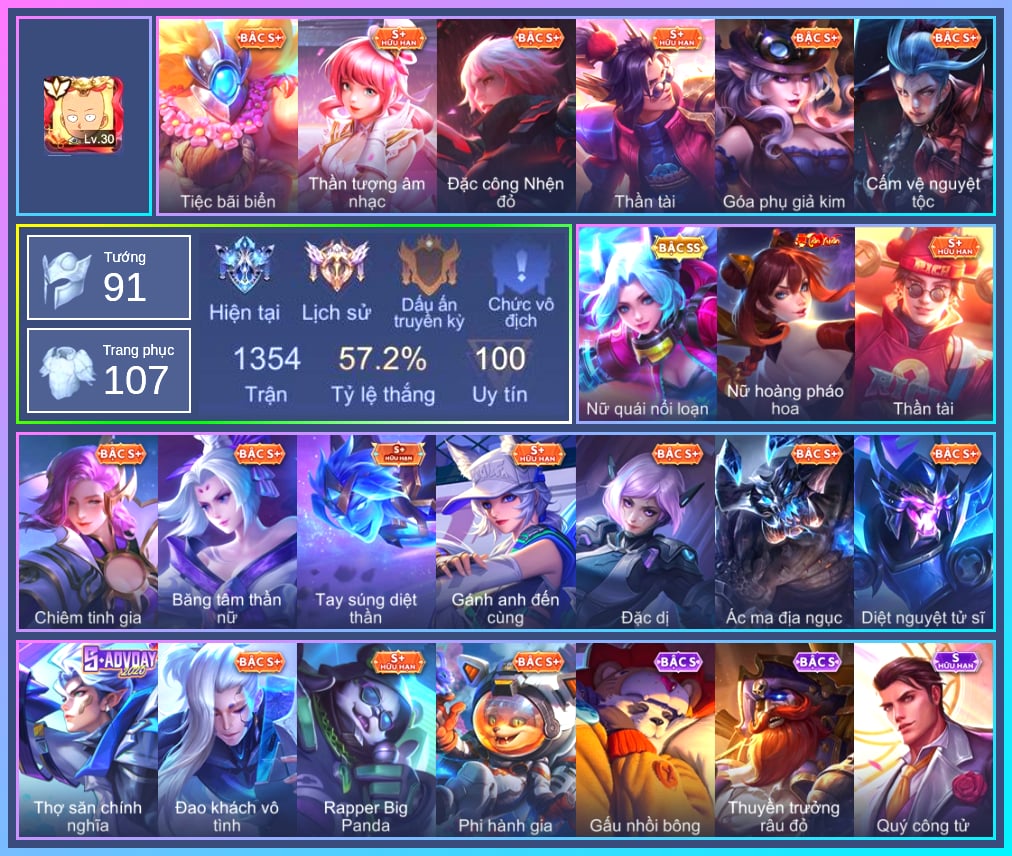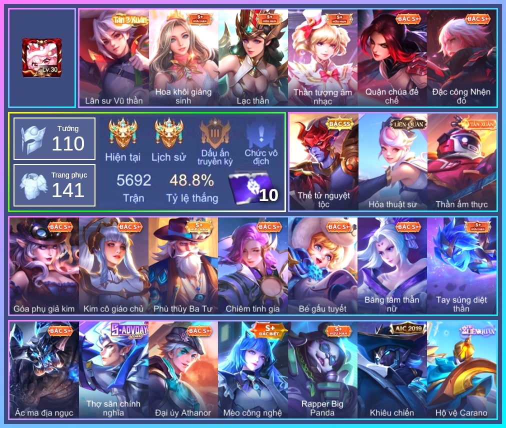 Valhein Hoàng tử Quạ, Valhein Số 7 Thần Sầu, Valhein Xạ Thần, Valhein S-Quang Vinh, Triệu Vân Thần Tài, Krixi Thuỷ Thủ, Mina Tiểu thư đoạt hồn, Mina Chị đại lắm chiêu, Yorn Soái ca bãi biển, Nakroth Quân đoàn địa ngục, Gildur phượt thủ, Gildur Đại gia học viện, Violet Nữ đặc cảnh, Violet Đặc Dị, Violet Tay Súng Siêu Phẩm, Violet Huy Chương Vàng, Toro Ngưu hải vương, Taara Hỏa Ngọc Nữ Đế, Cresht Thợ sửa cáp, Ilumia Hồng Hoa Hậu, Ilumia Thiên nữ áo dài, Ilumia Diva nổi loạn, Lauriel Lạc thần, Butterfly Thủy thủ, Butterfly Quận Chúa Đế Chế, Zephys Phi thương, Zephys Tư lệnh viễn chinh, Zephys Inosuke Hashibira, Zephys Đầu bếp Sashimi, Murad Thợ Săn Tiền Thưởng, Murad M-TP Thần Tượng Học Đường, Murad Đồ thần đao, Murad Đặc dị, Murad S-Quang Vinh, Điêu thuyền Vũ điệu nghê thường, Kriknak Bọ Cánh Bạc, Arthur Siêu sao Cricket, Natalya Quý Cô Thủy Tề, Raz Đại tù trưởng, Tulen Phù Thủy Kiến Tạo, Grakk Màu cờ sắc áo, Grakk Thần ẩm thực, Zill Lốc Địa Ngục, Zill Dung nham, Zill Diệt nguyệt tử sĩ, Zill Thần mộng mị, Alice Xứ sở thần tiên, Alice bé du xuân, Alice The Butterfly Mansion Girl, Ignis Quang Vinh, Arduin, Arduin Quang Vinh, Arduin Tà linh hiệp sỹ, Maloch Ác Ma Địa Ngục, Maloch Samurai Tử Sĩ, Maloch Ác nhân vô tuyến, Maloch Đại ca Mukbang, Ryoma Thợ Săn Tiền Thưởng, Ryoma Ailing Samurai, Lữ Bố Tiệc Bãi Biển, Lữ Bố Nam Vương, Lữ Bố Hoả Long Chiến Thần, Lữ Bố Vũ điệu Samba, Enzo Phẩm chất quý tộc, Enzo Thần thoại Hy Lạp, Baldum chú thợ ống nước, Yena Hoạt náo viên, Yena Nữ hoàng thể thao, Yena Nữ cướp biển, Darcy Pháp sư hỏa long, Zuka Đại Phú Ông, Zuka Phát Tài, Zuka Gấu Nhồi Bông, Zuka Đầu bếp hoàng cung, Zuka Rapper Big Panda, Airi Thích Khách, Airi Đặc công tử điệp, Airi Lễ hội mùa xuân, Keera Y tá lạ, Keera Nghệ sĩ Graffiti, Azzenka Quang Vinh 2.0, AzzenKa Giáng sinh An lành, Mganga Doombot Hủy Diệt, Capheny S-Quang Vinh, TelAnnas Chung Tình Tiễn, Telannas Dạ hội, TelAnnas Quang Vinh, Tel Annas Jujutsu Sorcerer, Dextra Lữ khách cao nguyên, Laville Tay đua đường phố, Laville Tay súng vô địch, Hayate Bạch ảnh, Hayate Bạch lang, Slimz Chú thỏ ngọc, Slimz Lẩu chua cay, Slimz Sứ giả Thiên giới, Slimz Siêu Cấp Tối Thượng, Lumburr, Fennik Nhà thám hiểm, Fennik Đội đặc nhiệm, Fennik Shipper Siêu thanh, Veera Nàng dơi tuyết, Veera Phù thủy Hội họa, Kahlii Siêu đầu bếp, Zip Ông trùm giáng sinh, Richter Bá tước, Richter Dạ hội, Richter Quang vinh 2.0, Kaine Thợ Săn Chính Nghĩa, Preyta Băng Hỏa Long Sư, KilGroth Cảnh Vệ Biển, Aoi Sát Thủ Đô Thị, Lindis Thám Tử Tư, Thane Kẻ Hủy Diệt, Thane Mật vụ, Thane Khoảnh khắc vinh quang, Omega Cỗ Máy Siêu Tốc, Omega Hộ Vệ Carano, Ngộ Không Đạo tặc, Ngộ Không Nhóc tỳ bá đạo, Ngộ Không Cổ thần Ai Cập, Dirak Quý tộc, Dirak Đường chủ yêu giới, Liliana thần tượng âm nhạc, Liliana Thuỷ thủ hồ ly, Allain Lân sư Vũ thần, Iggy Bạch hồ ly, Celica Nữ cao bồi, Celica S-Quang Vinh, Celica Tâm hồn trà sữa, Max Hiệp Sĩ Nhí, Max Tiểu King Kong, Amily Đặc công nhện đỏ, Amily Hội ám hoàng, Amily Thám tử trung học, Volkath Quang vinh, Astrid Hoa anh đào, Bright Soái ca thánh điện, Bright Kỳ Lân Soái, Qi Tiểu long, Qi Thiếu nữ pháo hoa, Qi Blogger Ẩm thực, Aleister Quỷ soái nguyệt tộc, Veres Đạo tặc, Veres Chị đại học đường, Florentino Hisoka, Florentino S-Quang Vinh, Sephera Chiêm tinh gia, Sephera Phi vụ thế kỷ, Tachi Đao khách vô tình, Krizzix Crursed Corpse, Roxie Lễ hội hoa, Aya Điệp viên ký ức, Yue Chiêm Tinh gia, Sinestrea Giấc mơ trưa, Sinestrea Lữ khách sa mạc, Sinestrea S-Quang vinh, Rouie Quang Vinh, Quillen Huyết phong, Ishar Tiểu thư kẹo ngọt, Ata Mèo đi mưa, Annette Xứ sở thần tiên, Annette Băng kỳ lâm, Omen Sĩ Quan Viễn Chinh, Omen Chiến binh trăng khuyết, Omen Thuyền trưởng hải tặc, Teemee Thịt xiên nướng, Thorne Ước nguyện giáng sinh, Dolia Môn đồ tập sự, Marja Linh Xà Tư Tế, Bonnie S Quang Vinh
