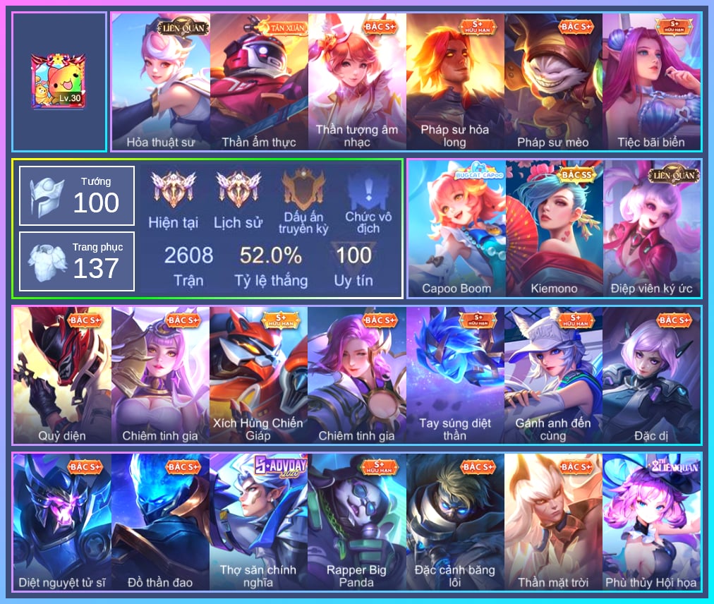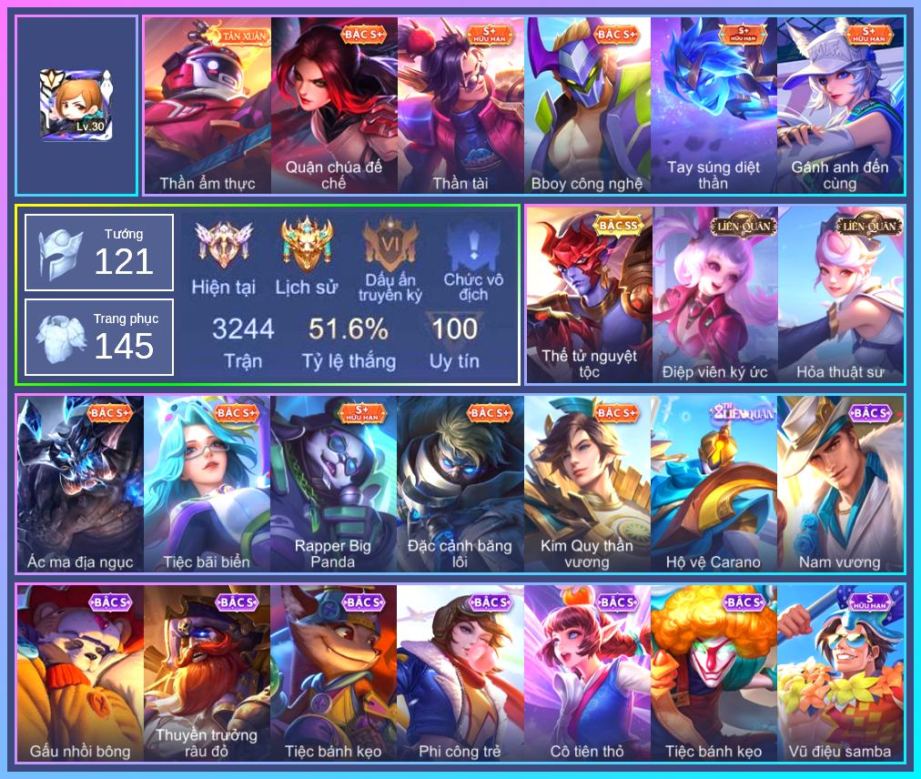 Valhein Hoàng tử Quạ, Valhein Vũ khí tối thượng, Valhein Số 7 Thần Sầu, Valhein S-Quang Vinh, Triệu Vân Quý Công Tử, Krixi Tiệc Bãi Biển, Krixi Phó văn nghệ, Krixi Thuỷ Thủ, TelAnnas Cảnh Vệ Rừng, TelAnnas Giám thị thân thiện, Telannas Dạ hội, TelAnnas Quang Vinh, Errol Diệt nguyệt tiên phong, Paine khúc nhạc tử vong, Violet Nữ đặc cảnh, Violet Phó học tập, Violet Đặc Dị, Toro Bạch mao Ngưu, Hayate Bạch ảnh, Hayate Bạch lang, Ryoma Đại Tướng Nguyệt Tộc, Ryoma Dạ hội, Ryoma Ailing Samurai, Baldum Đồ chơi, Amily Đặc cảnh NYPD, Amily Đặc công nhện đỏ, Amily Hội ám hoàng, Amily Nữ đội trưởng, Airi Thích Khách, Airi Đặc công tử điệp, Airi Lễ hội mùa xuân, Florentino Kiếm sĩ Olympic, Florentino Thần thoại Hy Lạp, Florentino S-Quang Vinh, Yena Nữ cướp biển, Volkath Tư lệnh viễn chinh, Volkath Quang vinh, Bright Kỳ Lân Soái, Qi Tiểu long, Qi Thiếu nữ pháo hoa, Celica S-Quang Vinh, Krizzix Crursed Corpse, Ishar Giấc Mơ Ngọt Ngào, Dirak Quý tộc, Murad M-TP Thần Tượng Học Đường, Murad Thiên Tài Sân Cỏ, Mganga Hề cung đình, Mganga Pháp sư mèo, Mganga Doombot Hủy Diệt, Grakk Thuyền Trưởng Râu Đỏ, Grakk Thần ẩm thực, Fennik Nhà thám hiểm, Fennik Đội đặc nhiệm, Fennik Tiệc Bánh Kẹo, Maloch Tiệc hóa trang, Maloch Đại ca Mukbang, Kahlii Kim cô giáo chủ, Kahlii Rối Nước Thuỷ Đình, Butterfly Gánh anh đến cùng, Alice Bé Gấu Tuyết, Alice Xứ sở thần tiên, Alice Dạ hội, Alice The Butterfly Mansion Girl, Lauriel Đọa Lạc Thiên Sứ, Ngộ Không Đạo tặc, Ngộ Không Hỏa Nhãn Kim Tinh, Ngộ Không Siêu việt, Ngộ Không Nhóc tỳ bá đạo, Ngộ Không Cổ thần Ai Cập, Zuka Gấu Nhồi Bông, Zuka Rapper Big Panda, Ata Quang vinh, Max Hiệp Sĩ Nhí, Thorne Thám tử trung học, Aleister Thiếu Niên Hắc Ám, Aleister Quỷ soái nguyệt tộc, Slimz Lẩu chua cay, Richter Dạ hội, Richter Quang vinh 2.0, Zill Lốc Địa Ngục, Zill Diệt nguyệt tử sĩ, Zill Thần mộng mị, Lindis Thám Tử Tư, Raz Đại tù trưởng, Raz Saitama Cosplay, Tulen Dạ hội, Nakroth Quán quân, Nakroth Producer Tia chớp, Zip Cá siêu quậy, Capheny S-Quang Vinh, Keera Học viên Carano, Keera Nghệ sĩ Graffiti, Azzenka Quang Vinh 2.0, Veera Goá Phụ, Veera Thiên nga đen, Elandorr Phi vụ thế kỷ, Elandorr Học viện Carano, Mina Tiệc Bánh Kẹo, Marja Linh Xà Tư Tế, Sephera Chiêm tinh gia, Sephera Thủy Liên Hoa, Roxie Lễ hội hoa, Enzo Phẩm chất quý tộc, Enzo Chiến binh trăng khuyết, Enzo Thần thoại Hy Lạp, Omega Hộ vệ ba bích, Omega Hộ Vệ Carano, Liliana Hồ Quý Phi, Liliana thần tượng âm nhạc, Liliana Thuỷ thủ hồ ly, Arthur Siêu sao Cricket, Rouie Quang Vinh, Annette Xứ sở thần tiên, Lorion Chiến giáp hắc ám, Ignis Bắc băng vương, Ignis Vì sao con khóc, Aya Điệp viên ký ức, Xeniel Shipper bánh mỳ, Teemee Thịt xiên nướng, KilGroth Cảnh Vệ Biển, Bonnie S Quang Vinh