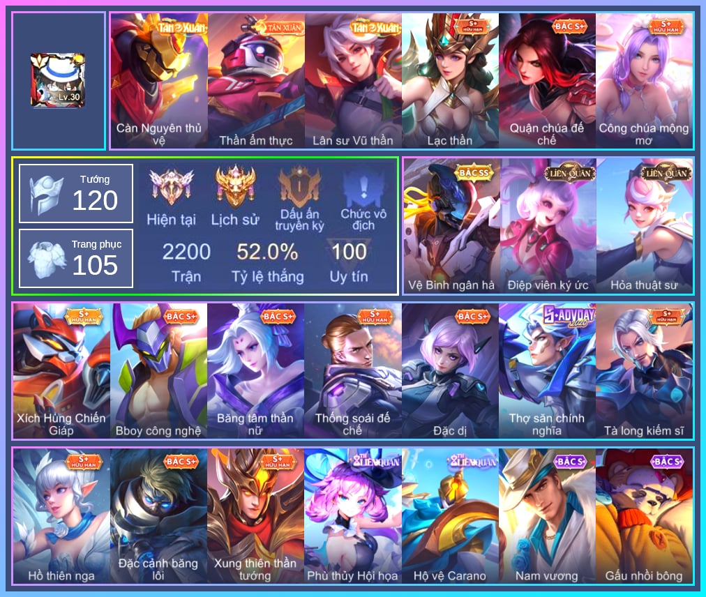 Arthur Đặc cảnh băng lôi, Krixi Xứ Sở Thần Tiên, Krixi Phó văn nghệ, Krixi Hồ Thiên Nga, TelAnnas Giám thị thân thiện, Telannas Dạ hội, TelAnnas Công chúa mộng mơ, Tel Annas Jujutsu Sorcerer, Valhein Số 7 Thần Sầu, Mganga Doombot Hủy Diệt, Butterfly Quận Chúa Đế Chế, Butterfly Bình Minh Tận Thế, Violet  Đặc Dị, Violet Huy Chương Vàng, Alice Dạ hội, Alice The Butterfly Mansion Girl, Triệu Vân Quý Công Tử, Triệu Vân Chiến tướng mùa đông, Natalya Băng tâm thần nữ, Allain Lân sư Vũ thần, Maloch Samurai Tử Sĩ, Veera Phù thủy Hội họa, Stuart Vua hề, Yorn Đặc Nhiệm Swat, Yorn Vệ Binh ngân hà, Grakk Thần ẩm thực, Azzenka Quang Vinh 2.0, Hayate Bạch ảnh, Hayate Bạch lang, Toro Bạch mao Ngưu, Kahlii Rối Nước Thuỷ Đình, Roxie Hầu gái, Roxie Cháy Phố, Roxie Hỏa thuật sư, Volkath Xung thiên thần tướng, Volkath Quang vinh, Airi Đặc công tử điệp, Aya Điệp viên ký ức, Ngộ Không Cổ thần Ai Cập, Sinestrea Lữ khách sa mạc, Sinestrea S-Quang vinh, Quillen Thống soái đế chế, Quillen Huyết phong, Slimz Lẩu chua cay, Slimz Sứ giả Thiên giới, Slimz Siêu Cấp Tối Thượng, Bright Soái ca thánh điện, Lauriel Lạc thần, Nakroth BBoy công nghệ, Nakroth Producer Tia chớp, Nakroth Siêu Việt 1, Zip Ông trùm giáng sinh, Gildur Đại gia học viện, Raz Đại tù trưởng, Raz Saitama Cosplay, Zuka Gấu Nhồi Bông, Zuka Đầu bếp hoàng cung, Zuka Xích Hùng Chiến Giáp, Capheny S-Quang Vinh, Enzo Phẩm chất quý tộc, Enzo Chiến binh trăng khuyết, Florentino Kiếm sĩ Olympic, Florentino Tà long kiếm sĩ, Florentino Hisoka, Florentino S-Quang Vinh, Lữ Bố Nam Vương, Lữ Bố Vũ điệu Samba, Veres Chị đại học đường, Dextra Lữ khách cao nguyên, Laville Tay đua đường phố, Laville Thám tử học đường, Arduin Tà linh hiệp sỹ, Yena Nữ hoàng thể thao, Keera Hồ điệp, Xeniel Shipper bánh mỳ, Baldum Đồ chơi, Celica S-Quang Vinh, Liliana Thuỷ thủ hồ ly, Fennik Đội đặc nhiệm, Zill Thần mộng mị, Dolia Môn đồ tập sự, Tachi Lãng khách, Tachi Đao khách vô tình, Zephys Phi thương, Teemee Giấc Mơ Ngọt Ngào, Max Hiệp Sĩ Nhí, Max Trà Chanh, Arum Thần tượng nhạc Rock, Lindis Đồng phục Shihakusho, Qi Blogger Ẩm thực, Ryoma Dạ hội, Tulen Phó kỷ luật, Omega Hộ Vệ Carano, Kaine Thợ Săn Chính Nghĩa, Omen Thuyền trưởng hải tặc, Errol Vượt ngục, Thorne Ước nguyện giáng sinh, Thorne Thám tử trung học, KilGroth Càn Nguyên Thủ Vệ, Annette Xứ sở thần tiên, Ishar Giấc Mơ Ngọt Ngào, Lorion Chiến giáp hắc ám, Bonnie S Quang Vinh, Amily Thám tử trung học, Ignis Vì sao con khóc