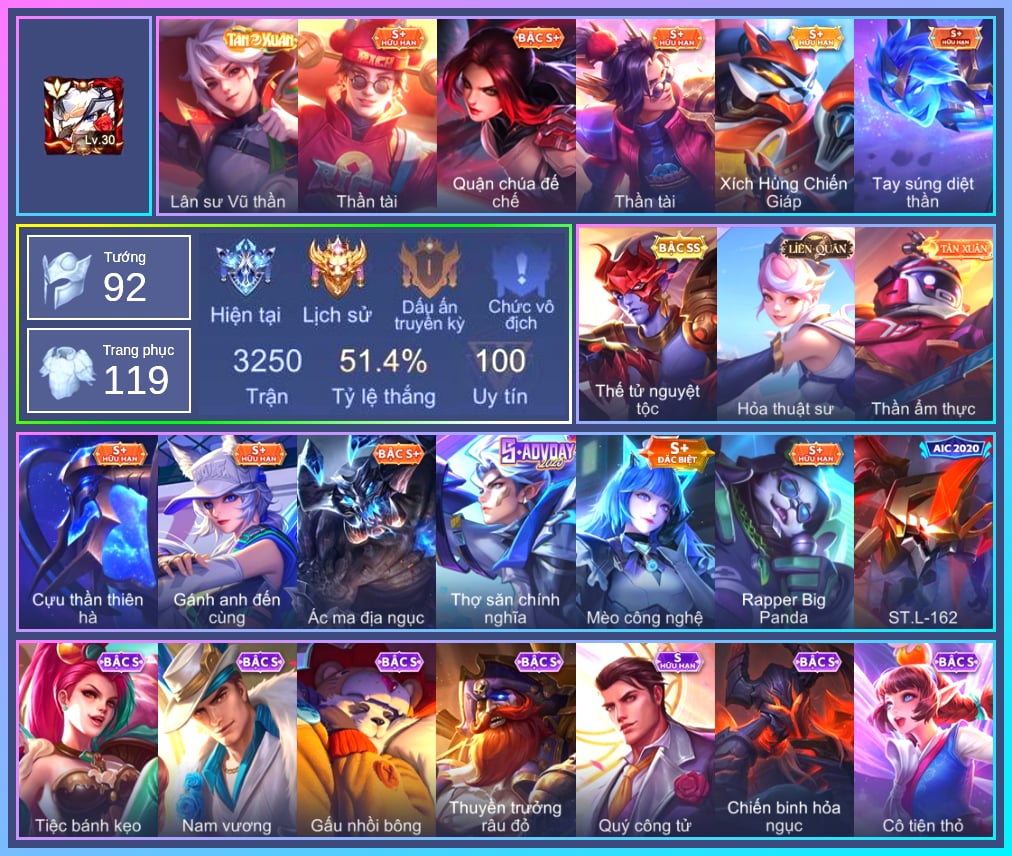 Valhein Hoàng tử Quạ, Valhein Thần tài, Valhein S-Quang Vinh, Triệu Vân Quý Công Tử, Triệu Vân Thần Tài, Krixi Cô Tiên Thỏ, Krixi Phó văn nghệ, Krixi Thuỷ Thủ, Mganga Hề cung đình, Mganga Doombot Hủy Diệt, Grakk Thuyền Trưởng Râu Đỏ, Grakk Khô Lâu Đại Tướng, Grakk Thần ẩm thực, Butterfly Teen Nữ Công Nghệ, Butterfly Quận Chúa Đế Chế, Butterfly Gánh anh đến cùng, Maloch Ác Ma Địa Ngục, Maloch Samurai Tử Sĩ, Mina Tiệc Bánh Kẹo, Mina Đào tạo siêu sao, Allain Lân sư Vũ thần, Preyta Không Tặc, Teemee Thịt xiên nướng, Dirak Quý tộc, Dirak Ông bầu Showbiz, Arduin, Arduin Tà linh hiệp sỹ, Amily Hội ám hoàng, Yorn Thế Tử Nguyệt Tộc, Yorn Soái ca bãi biển, Kaine Đôi Cánh Đại Dương, Kaine Người dơi, Kaine Thợ Săn Chính Nghĩa, Taara Hỏa Ngọc Nữ Đế, Kahlii Siêu đầu bếp, Tulen Dạ hội, Zephys Đầu bếp Sashimi, Kriknak Bọ Cánh Bạc, Kriknak ST.L-162, Nakroth Chiến Binh Hỏa Ngục, Nakroth Quân đoàn địa ngục, Nakroth Siêu Việt 1, Lauriel Đọa Lạc Thiên Sứ, Lauriel Nữ vương học đường 2, Zuka Gấu Nhồi Bông, Zuka Đầu bếp hoàng cung, Zuka Rapper Big Panda, Zuka Xích Hùng Chiến Giáp, Điêu Thuyền Nữ Vương Anh Đào, Điêu Thuyền Mèo công nghệ, KilGroth Cảnh Vệ Biển, TelAnnas Cảnh Vệ Rừng, Telannas Thánh nữ mật hội, Telannas Dạ hội, TelAnnas Quang Vinh, Natalya Quý Cô Thủy Tề, Dextra Quý cô Tuổi Dần, Florentino Vũ kiếm sư, Florentino S-Quang Vinh, Elsu Mafia, Ata Quang vinh, Ata Mèo đi mưa, Aoi Sát Thủ Đô Thị, Keera Thuỷ thủ, Keera Hồ điệp, Errol Vượt ngục, Errol Stream đến bao giờ, Capheny S-Quang Vinh, Ilumia Nữ Chúa Tuyết, Ilumia Ngược dòng thời gian, Max Thần thoại Hy Lạp, Max Chuyên gia đập hộp, Max Trà Chanh, Sinestrea Lữ khách sa mạc, Raz Đại tù trưởng, Violet Nữ đặc cảnh, Violet Phó học tập, Airi Thích Khách, Airi Đặc công tử điệp, Azzenka Quang Vinh 2.0, Qi Thiếu nữ pháo hoa, Zill Cựu thần thiên hà, Zill Thần mộng mị, Fennik Nhà thám hiểm, Fennik Đội đặc nhiệm, Fennik Tay đua F1, Omen Sĩ Quan Viễn Chinh, Veres Đạo tặc, Veres Chị đại học đường, Enzo Thần thoại Hy Lạp, Zip Cá siêu quậy, Ngộ Không Đạo tặc, Ngộ Không Nhóc tỳ bá đạo, Ngộ Không Cổ thần Ai Cập, Lữ Bố Nam Vương, Roxie Hầu gái, Roxie Lễ hội hoa, Roxie Hỏa thuật sư, Arthur Hoàng kim cốt, Arthur Siêu sao Cricket, Stuart Gã hề, Hayate Bạch ảnh, Hayate Bạch lang, Richter Quang vinh 2.0, Laville Tay súng diệt thần, Ryoma Dạ hội, Xeniel Thiên Sứ Hủy Diệt, Murad Thợ Săn Tiền Thưởng, Murad S-Quang Vinh, Rouie Quang Vinh, Alice Dạ hội, Alice The Butterfly Mansion Girl, Slimz Thỏ nhồi bông, Slimz Sứ giả Thiên giới, Lorion Chiến giáp hắc ám, Liliana Thuỷ thủ hồ ly, Sephera Thủy Liên Hoa, Volkath Quang vinh, Bonnie S Quang Vinh